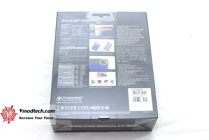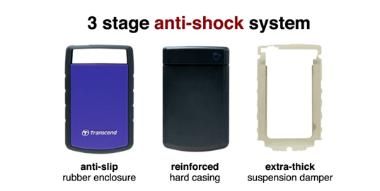 ...จากฉลากตรงนี้เราจะเห็นได้ว่า คุณสมบัติหลักๆของ StoreJet 25H3 นี้ก็คือ การป้องกันการกระแทก 3 ระดับขั้นที่ Transcend ออกแบบมา ซึ่งอย่างแรกคือ การป้องกันการหลุดจากการจับถือ หรือ Anti-Slip ถัดมาคือ reinforced คือการมีตัวบอดี้และเคสที่คลุมตัวฮาร์ดไดร์ฟลึกลงไปจากตัวกริ๊ปยาง ที่มีความหนาและแข็งแรง ขั้นที่สาม ขั้นสุดท้าย ด้านในสุดนั้นจะเป็นระบบ suspension damper ที่ทำหน้าที่คล้ายๆช่วงล่างรถยนต์ในการดูดซับแรงกระแทก ที่เกิดจากการกระแทกจริงๆ