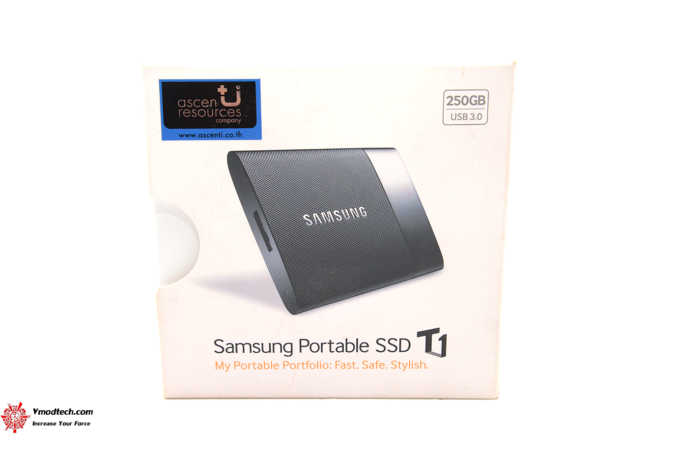 มากันในรูปร่างหน้าตาของ Samsung Portable SSD T1 250 GB มาในกล่องสีขาวบอกรายละเอียดชื่อรุ่นต่างๆ