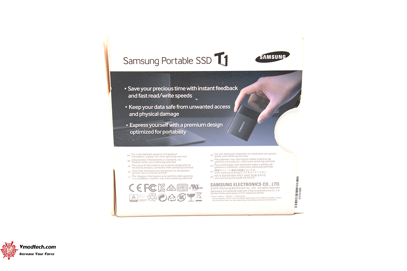 ด้านหลังกล่องบอกรายละเอียดฟีเจอร์ต่างๆอุปกรณ์ต่างๆที่ให้มาก็มีคู่มือ สายเชื่อมต่อ USB 3.0 และตัว Samsung Portable SSD T1 250 GB ครับ
