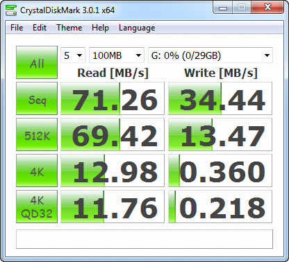 ใกล้เคียงกันอีกเช่นเคยครับ ผลการอ่านเขียนที่ไฟล์ขนาด 100 เมกได้ 71/31 พอสมควรเลย