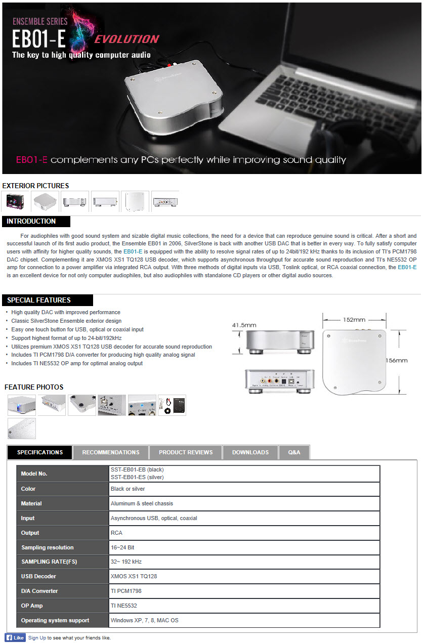 สวัสดีครับ วันนี้มาพบกับรีวิวอุปกรณ์เกี่ยวกับเสียงที่ใช้ร่วมกับคอมพิวเตอร์กันอีกซักครั้งครับ ทางทีมงานได้รับอุปกรณ์ที่เรียกกันว่า DAC มาจาก Neolution Group มาทำการทดสอบในวันนี้ จริงๆแล้ว SilverStone EB01-E นั้นได้ขายในตลาดมาเป็นเวลาพอควรแล้วครับ สิ่งที่น่าสนใจของ DAC ตัวนี้ก็คือหน้าตาครับ แรกพบนั้นถึงกับอึ้งครับว่าเค้าลงทุนทำตัวถังในสวยสดงดงามแบบนี้เพื่อมาใช้กับคอมพิวเตอร์เชียว เท่าที่เคยเห็น ไม่ว่าจะเสียงดีหรือไม่ดีก็ตามหน้าตานั้นจะออกบ้านๆไม่สวยสง่าแบบนี้เลย แต่ก็อีกครับ DAC เอาไว้ฟังเสียงครับไม่ได้ดูหน้าตา ก่อนที่จะไปคุยกันเรื่องเสียงของมัน เรามาชมรายละเอียดจากหน้าเว็บของ SilverStone กันก่อนครับ