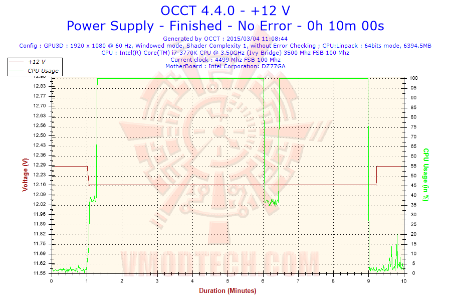 พิจารณาไฟ +12V ไม่มีโหลดอยู่ที่ประมาณ 12.29V ระหว่างมีโหลดตกลงมาที่ประมาณ 12.16V ตลอดการทดสอบ