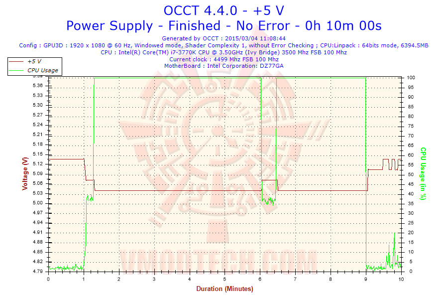 พิจารณาไฟ +5V ไม่มีโหลดอยู่ที่ประมาณ 5.13V ระหว่างมีโหลดตกลงมาที่ประมาณ 5.04V เนียนๆ
