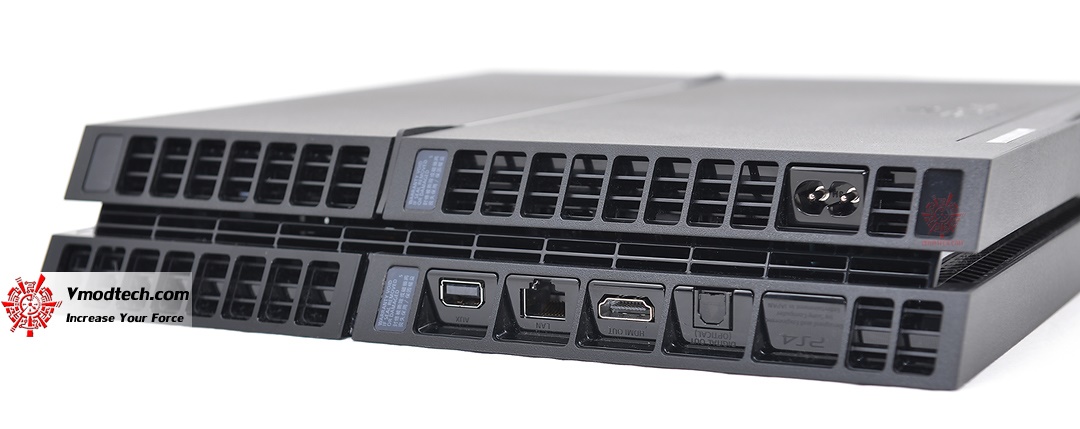 ด้านหลังของตัว PS 4 ครับ ก็จะมี auxiliary port สำหรับต่อกล่อง ช่องเสียบสายแลน ช่องเสียบ HDMI ออกจอ ช่องเสียบ Optical output สำหรับต่อเสียงไปออก Amplifier ภายนอก ส่วนขวาสุดก็เป็นสายไฟเข้าเครื่องซึ่งภายในนั้นจะมีชุด Power supply อยู่ด้วย