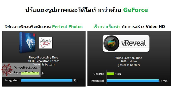 ไม่เพียงแต่ประสิทธิภาพที่เพิ่มขึ้นและกราฟฟิกที่สวยงามกว่าเท่านั้น ความเร็วในการใช้งานด้านการปรับแต่งรูปและวีดีโอนั้นก็เร็วขึ้น กับการแต่งรูปความละเอียดสูงจำนวนมากในโปรแกรม Photoshop นั้น พลังของ GeForce GT 630 นั้นทำให้รูปภาพทั้งหมดเสร็จสิ้นภายในเวลาเพียงแค่ 18 วินาที ในขณะที่กราฟฟิกการ์ดบน CPU นั้นต้องใช้เวลามากถึง 51 วินาที หรือการสร้างวีดีโอแบบ Full HD บน vReveal นั้น GeForce GT 630 สามารถช่วยให้กระบวนการเสร็จสิ้นภายในเวลาไม่เกินสองนาที ขณะที่กราฟฟิกการ์ดบน CPU นั้นต้องใช้เวลามากกว่าถึง 12 นาที
