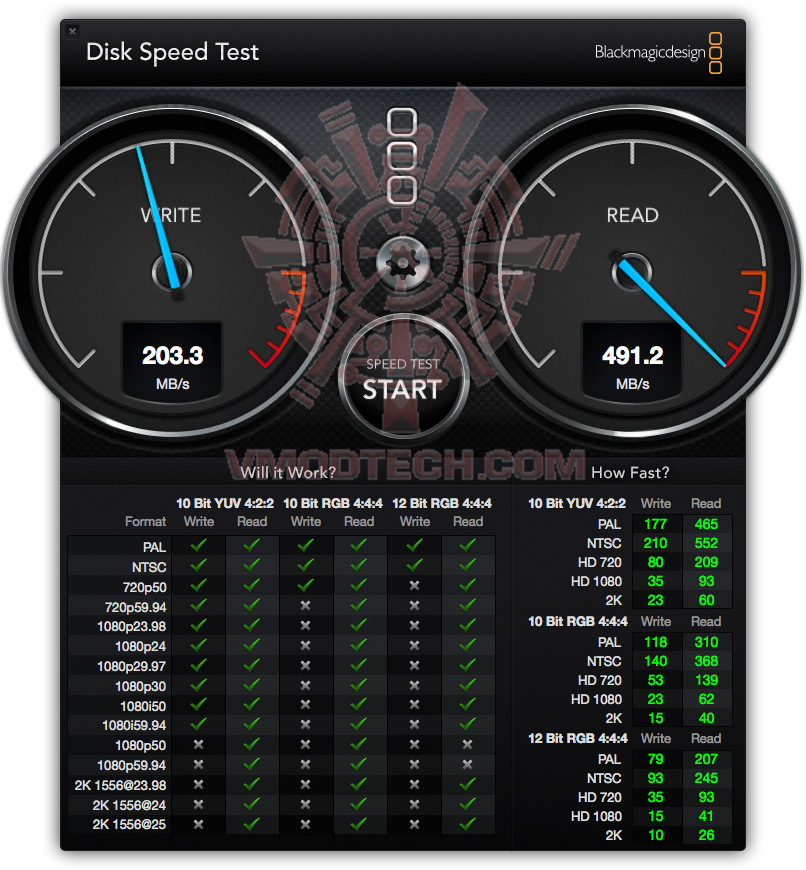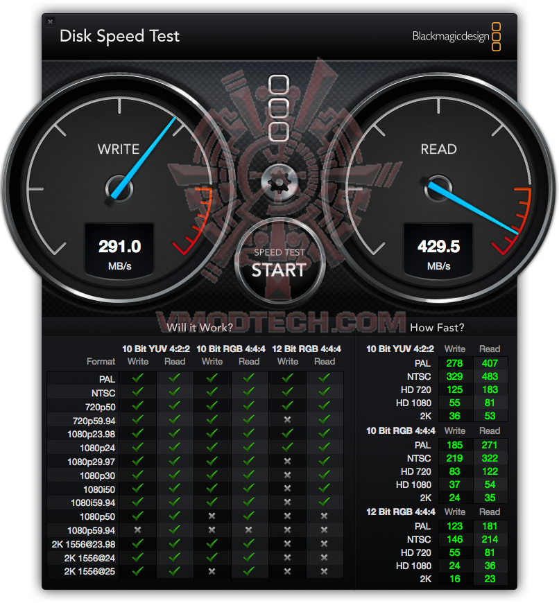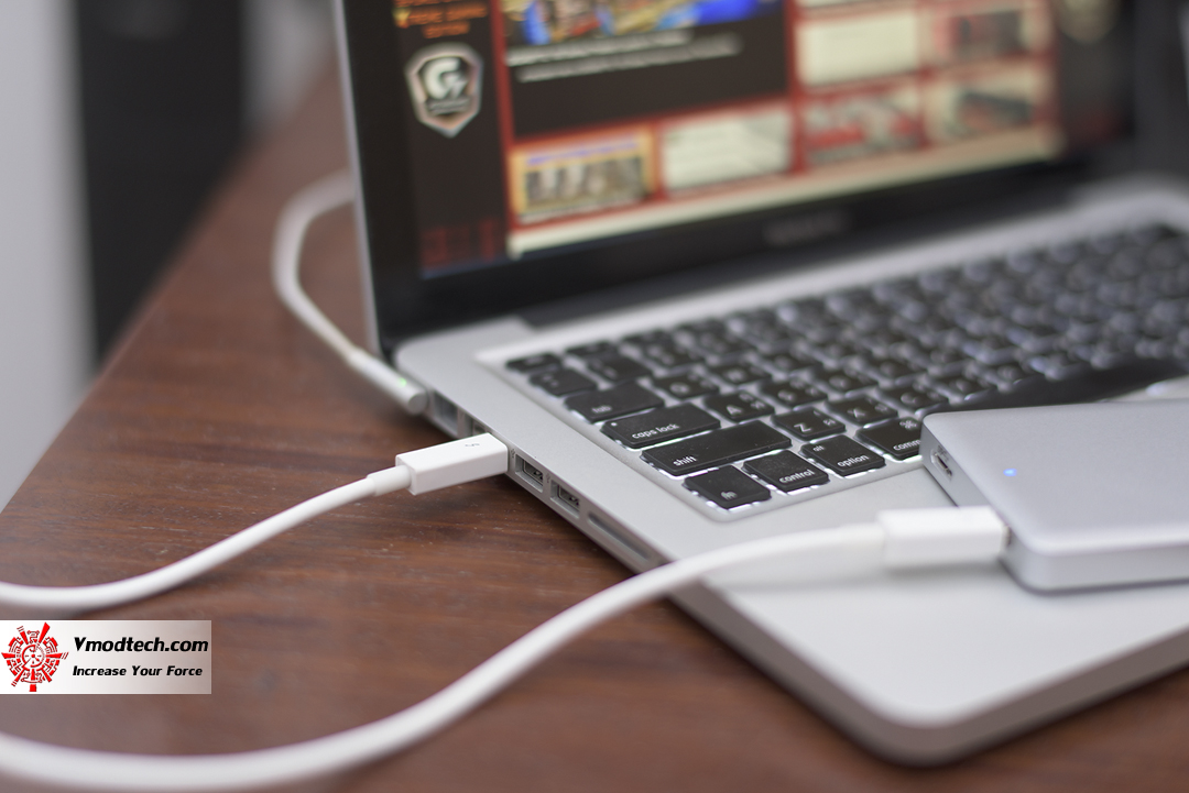 thunderboltผลการทดสอบด้วยโปรแกรม Black Magic นั้นเห็นได้ว่า ความเร็วในการอ่าน/เขียนนั้นจะอยู่ที่ประมาณ 384/291 เมกกะไบท์ต่อวินาที ด้วยการเชื่อมต่อแบบ Thunderbolt