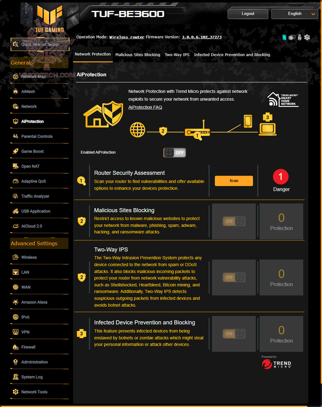 เมื่อเราเซตค่าต่างๆเรียบร้อยแล้ว ก็จะเข้ามาที่หน้าหลักตามที่เห็นซึ่งเป็นอินเตอร์เฟส ASUSWRT ที่คุ้นเคยกันดี Firmware ที่ใช้ที่ติดตัวมาตั้งแต่เปิดกล่องครับ ลองเช็คบนหน้าเว็บไซด์ยังไม่มีเวอร์ชั่นล่าสุดมาให้ดาวโหลดเลยครับ