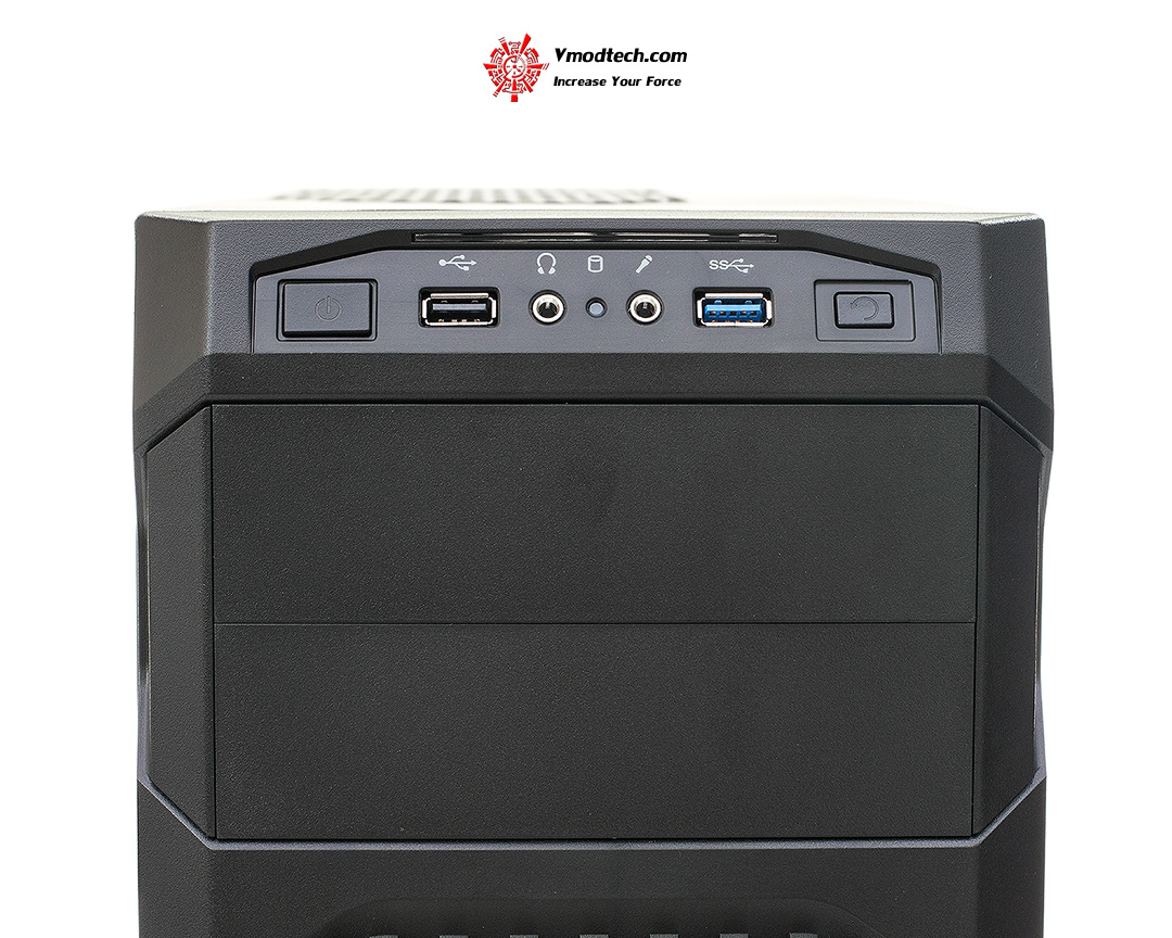ด้านบนสุดเป็น Front Panel มี Power Switch, Reset Switch, Audio, Mic, USB 3.0 และ USB 2.0 อย่างละ 1 ช่อง