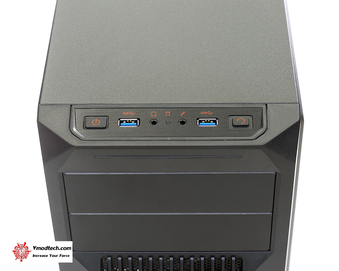Front Panel จะเยื้องขึ้นมาด้านบาน มี Power Switch, Reset Switch, Audio, Mic และ USB 3.0 2 ช่อง