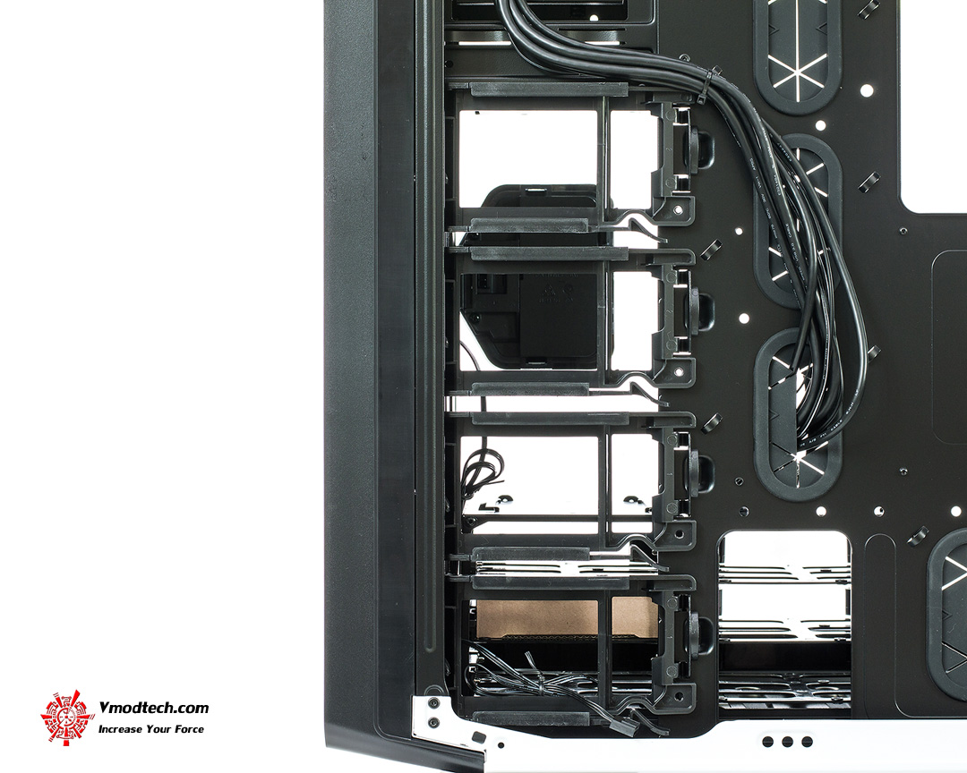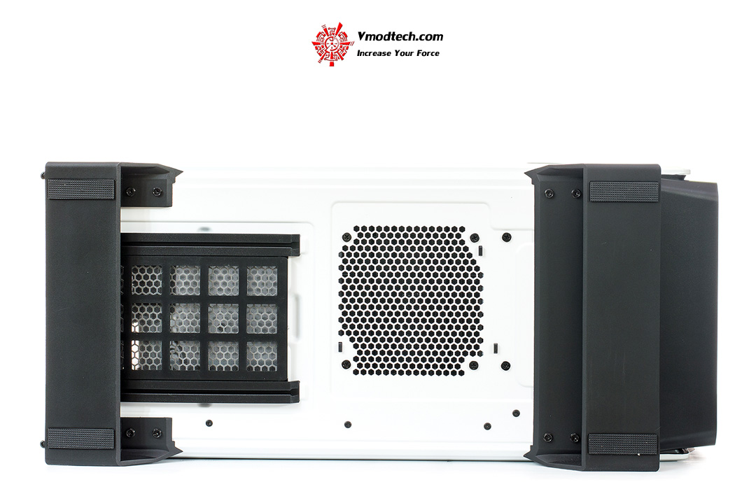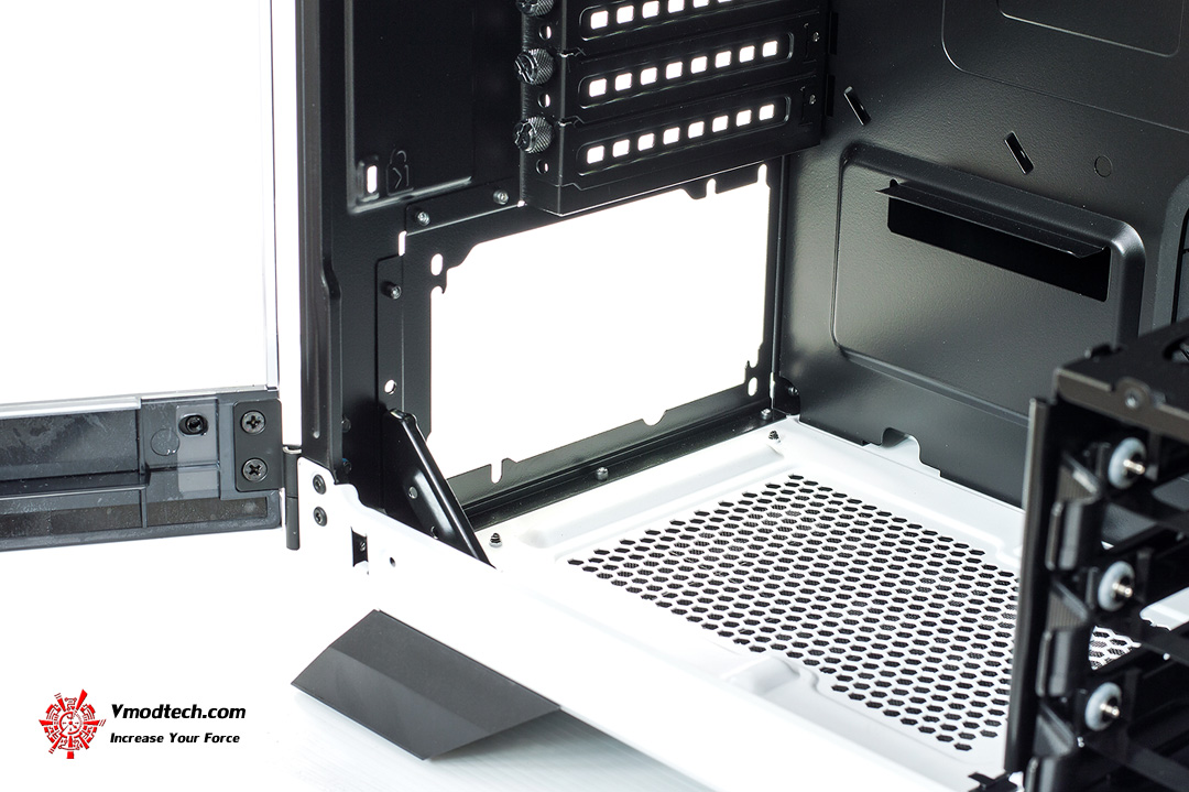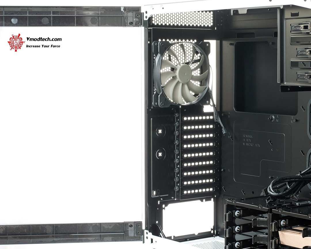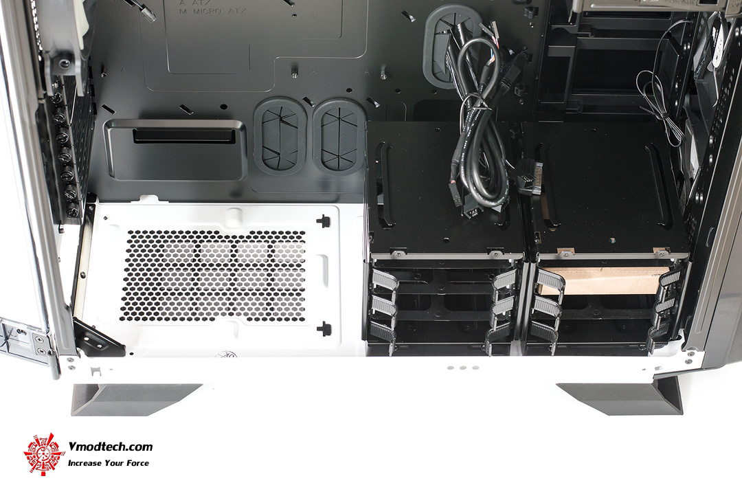 ดูด้านล่างภายในกันหน่อย นอกจากพื้นที่วาง PSU แล้ว ข้างๆสามารถเพิ่มพัดลม 120mm ได้ 1 ชิ้นครับ โดยใส่เข้าไปใต้ Drive Bays 3.5" ตัวใน
