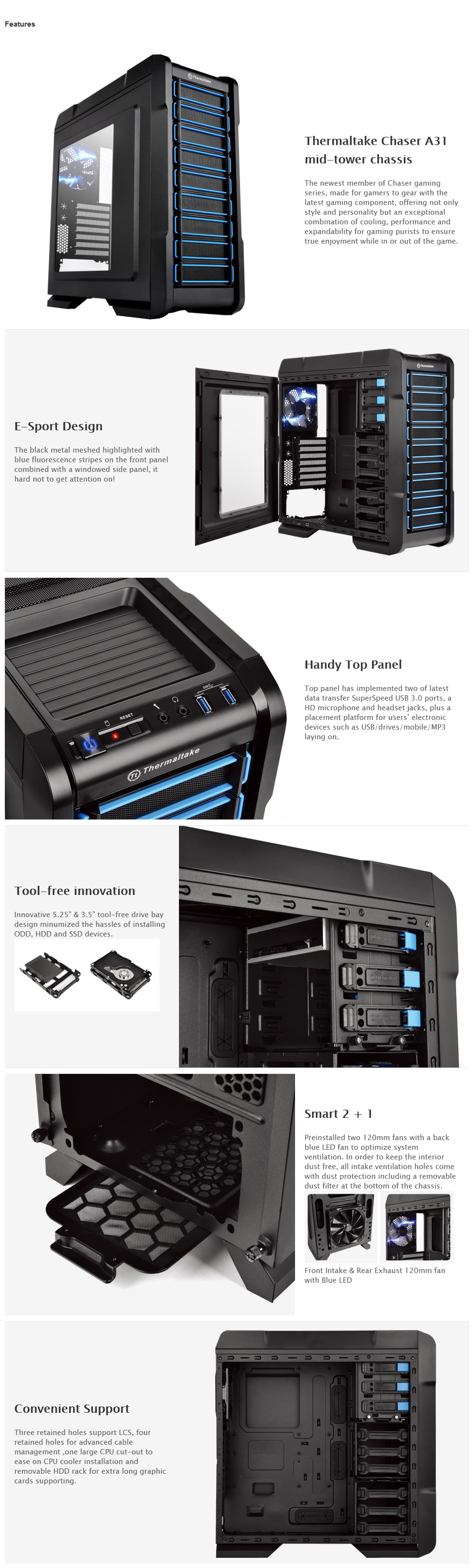 ..........สวัสดีครับวันนี้มาเปิดกล่องดูเคสกันอีกแล้วครับ กันเคสจาก Thermaltake รุ่น Chaser A31 mid-tower chassis เป็นเคส Mid-Tower PC Case อีก 1 รุ่น ที่มีให้เลือกซื้ออยู่ขณะนี้นะครับ รูปร่างหน้าตาแรกพบเมื่อแกะกล่องออกมาดู ต้องบอกว่าถูกใจอีกแล้วครับ และสำหรับ Thermaltake Chaser A31 mid-tower chassis มีให้เลือกหากัน 2 สีกันเลยครับคือขาวและดำ จะเป็นอย่างไรนั้น ช่วงนี้ไปชมรายละเอียดจากผู้ผลิตก่อนครับ