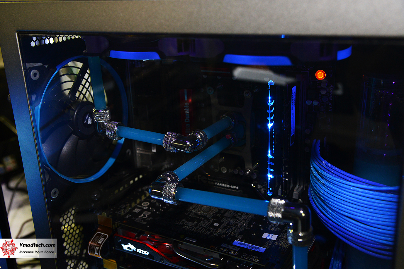 โดดด้วยระบบชุดน้ำที่เป็นสีฟ้าพร้อมทั้งพัดลมระบายความร้อนก็ยังเน้นสีฟ้ารวมทั้งตัวแรมเองก็สีฟ้าอีกด้วยครับ แจ่มจริงๆ