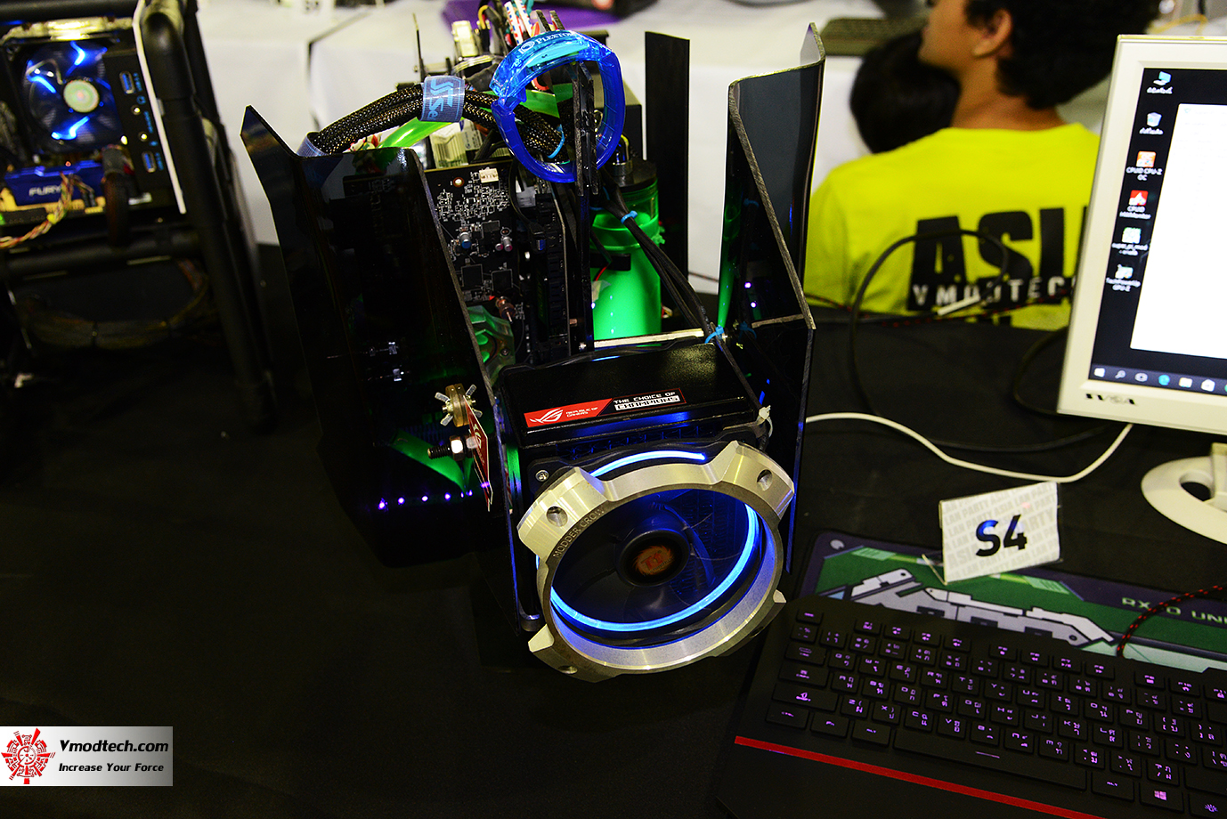 อีกเคสที่ผมเดินมาต้องส่องอยู่ค่อนข้างนานเพราะไม่แน่ใจว่าใช่ซิสเต็ม AMD หรือไม่ เพราะโดนสีสรรภายนอกหลอกตาให้งงอยู่นานครับ เป็นเคสที่ออกแบบเป็นพิเศษด้วยเองจริงๆ สร้างสรรค์มากๆครับ แนวแบบว่าเด็กๆเห็นนี่ชอบแน่นอนครับ ผมมองดูแล้วนึกถึงหุ่นยนต์ในสมัยเด็กๆพวกกันดั้มอะไรประมาณนี้ แต่ไม่ได้สอบถามนะครับว่าเจ้าของเคสเค้าโมดิฟายในแนวไหน เอาเป็นว่าสุดๆครับ มาดูไส้ในกันครับเป็นเมนบอร์ดจาก AMD FM2+ อีกแล้วครับ พร้อมทั้งชุดน้ำระบายความร้อนที่เน้นสีเขยวดูแล้วเพื่อให้ตัดกับสีฟ้าซึ่งมันก็ชวนเตะตาจริงๆ สวยแบบไม่เหมือนใครเลยครับเคสนี้