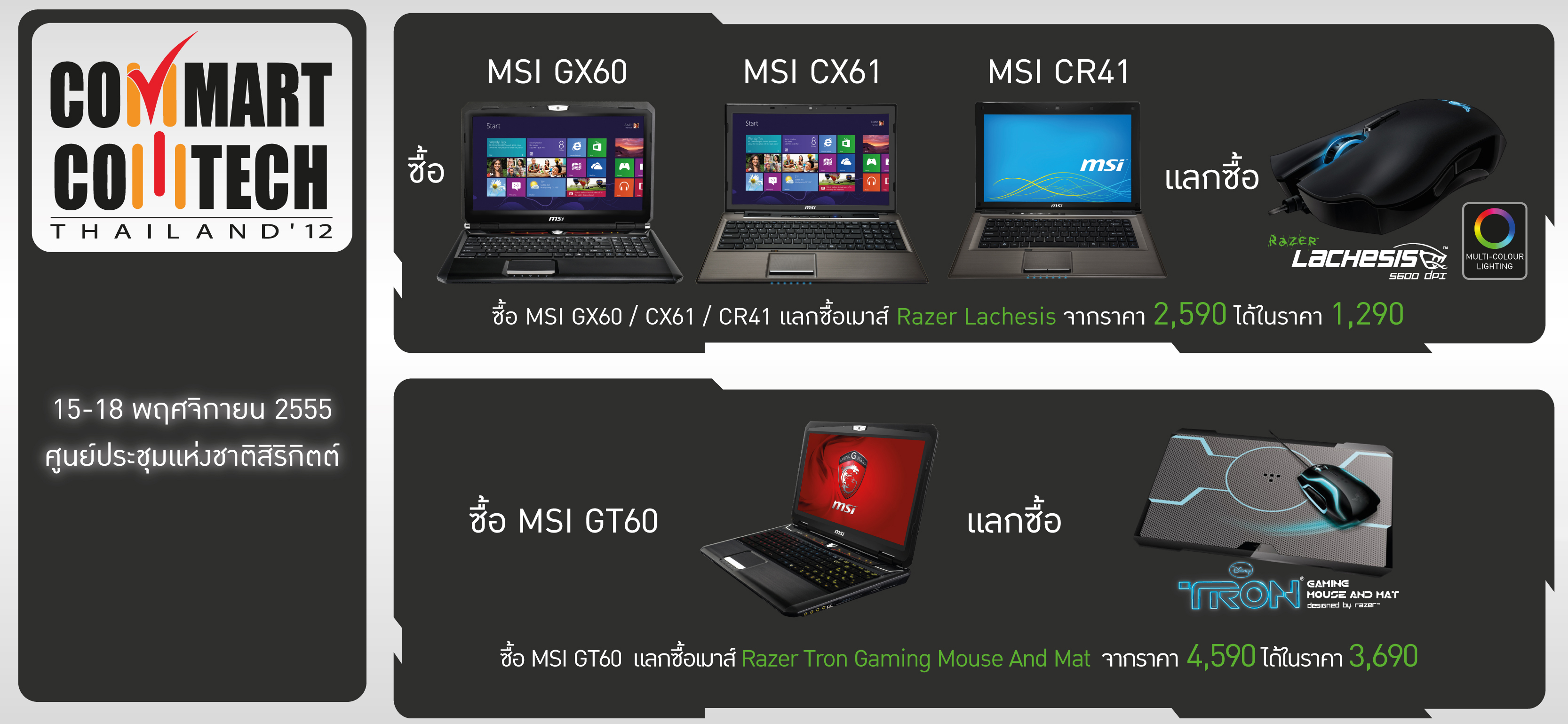 - ซื้อ MSI GX60 , MSI CX61 , MSI CR41แลกซื้อเมาส์ Razer Lachesis จากปกติราคา 2,590 บาท เหลือเพียง 1,290 บาท - ซื้อ MSI GT60 แลกซื้อเมาส์ Razer Tron Gaming Mouse and Mat จากปกติราคา 4,590 บาท เหลือเพียง 3,690 บาท พบกับพวกเราได้ที่ - บูธ P&Y zone C Ground ห้อง G102-G104 - บูธ Spa Office Zone C Ground ห้อง G125-G126 - บูธ J.I.B Zone C ชั้น 2 บูธ A19 - บูธ MSI Zone Plenary Hall แล้วเจอกันที่ Commart Comtech Thailand ณ ศูนย์ประชุมแห่งชาติสิริกิติ์ ตั้งแต่วันที่ 15 - 18 พฤศจิกายน 2555 เตรียมตัวให้พร้อม ช้าหมด อดนะจ๊ะ ^^ http://www.facebook.com/Ascenti.Resources http://www.facebook.com/OfficialRazerThailand https://twitter.com/#!/RazerThailand