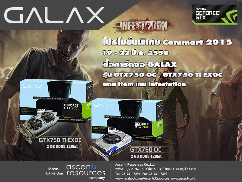 Ascenti Resources ร่วมกับ “GALAX” และ Electronic Extreme จัดโปรโมชั่นต้อนรับงาน Commart 2015 เพียงซื้อกราฟิกการ์ด “GALAX” รุ่น “GTX750 OC” หรือ “GTX750 Ti EXOC” รุ่นใดก็ได้ รับทันที Item เกม Infestation !!