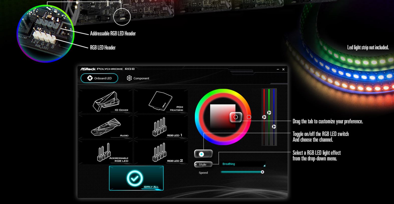 นอกจากการแสดงผลไฟ RGB LED ตามจุดต่างๆ บนเมนบอร์ดแล้ว ASRock ยังเพิ่ม หัวต่อ Addressable RGB LED สำหรับให้คุณได้สร้างสรรค์แสงไฟที่สวยงาม ร่วมกับ RGB strip และอุปกรณ์ต่างๆ ได้ร่วมกัน ผ่านทาง.ซอฟต์แวร์ Polychrome RGB Sync-certified ได้อีกด้วย