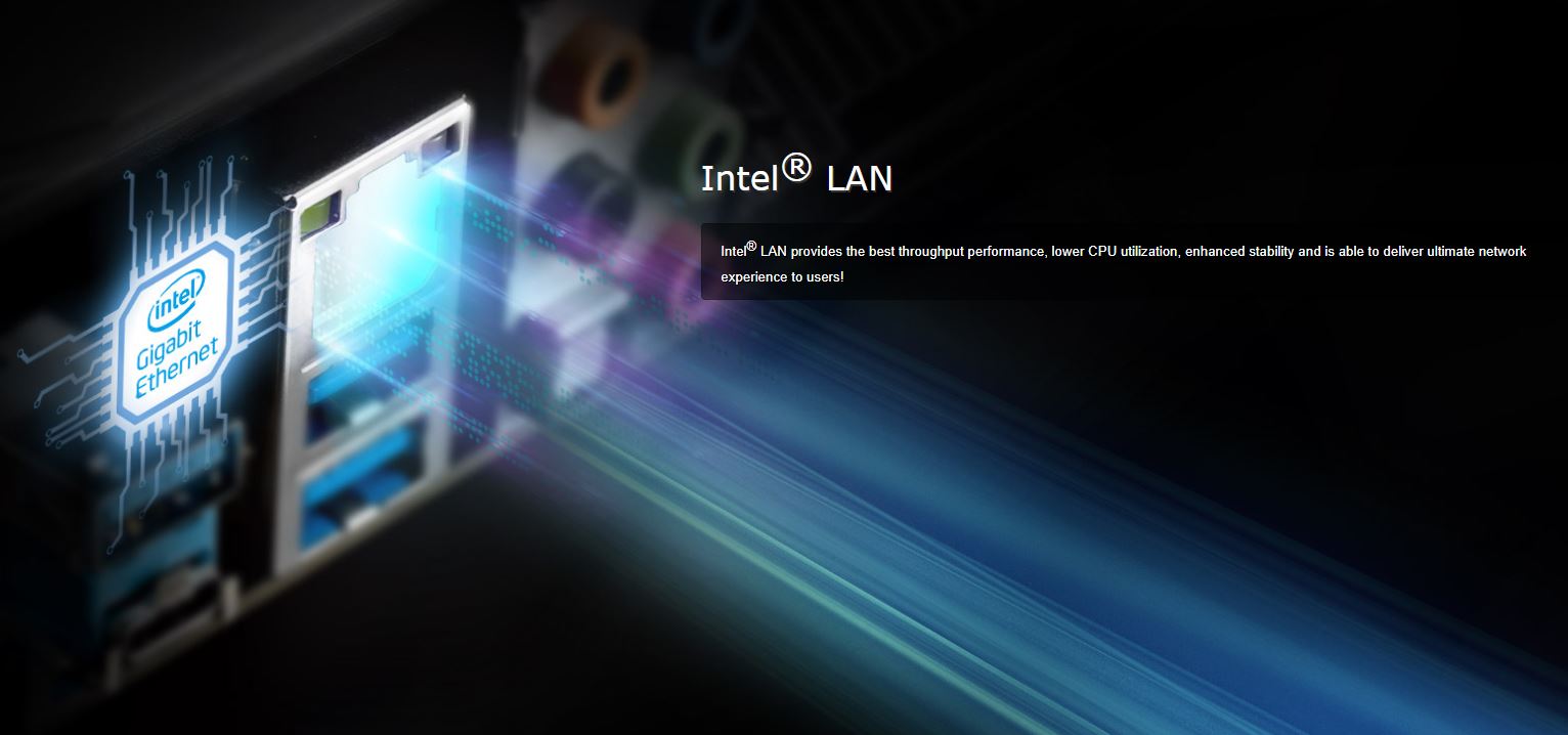 เพื่อเร่งการเชื่อมต่อข้อมูลสำหรับเล่นเกมให้ถึงขีดสุด เมนบอร์ดจึงมาพร้อม Intel Gigabit LAN ที่ลดการใช้พลังของซีพียู ให้ความเสถียรและมอบประสบการณ์ที่ดีในการเล่นเกมให้กับเหล่าเกมเมอร์