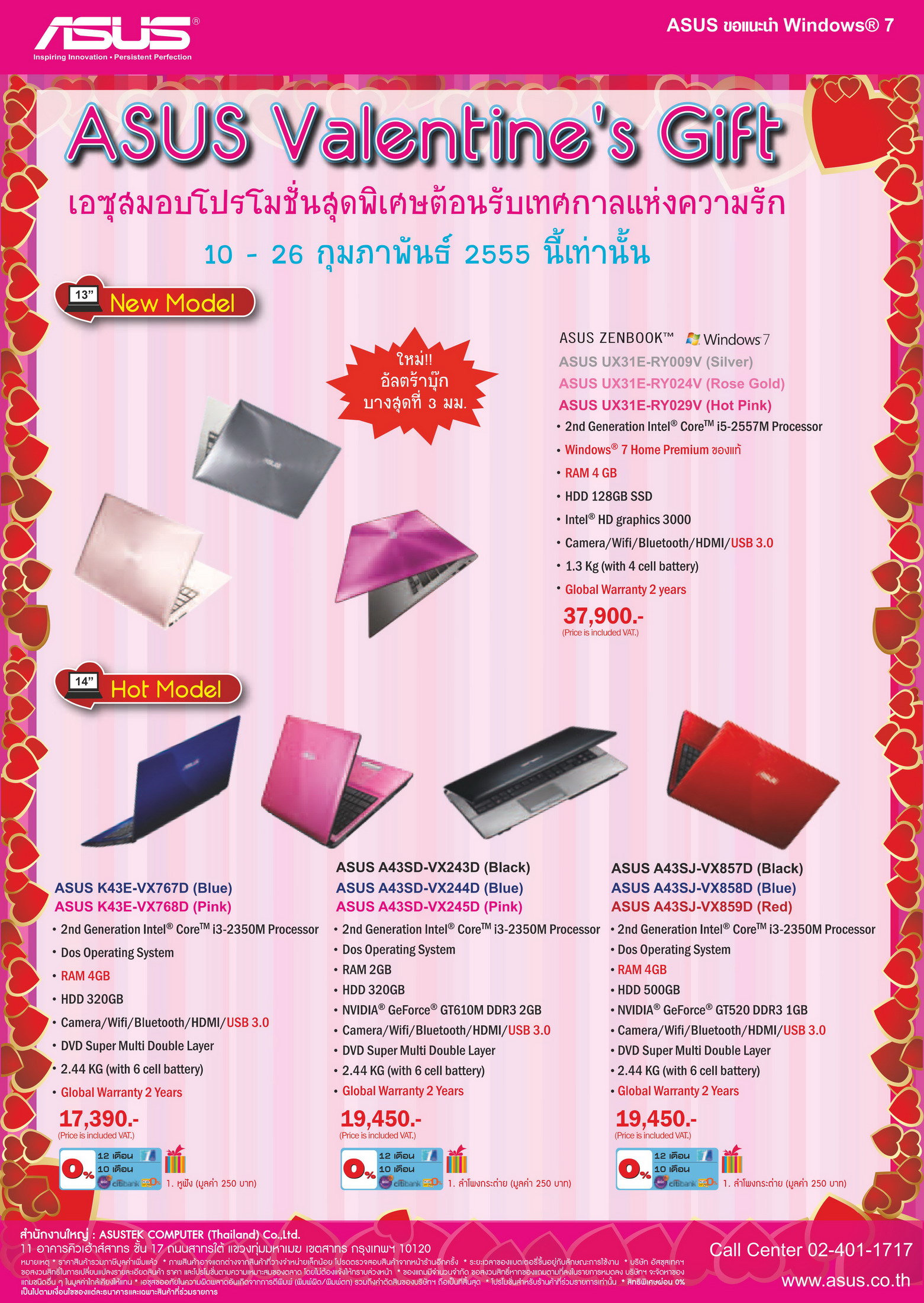 เอซุส จัดแคมเปญพิเศษรับเทศกาลแห่งความรัก ด้วยราคาและของแถมโดนใจ กับสินค้าไอที ในหมวดโน้ตบุ๊ก ให้คุณเลือกเพื่อเป็นของขวัญในเทศกาลสุดพิเศษนี้ พร้อมรับสิทธิผ่อน 0% นานสูงสุด 10 เดือน ตั้งแต่วันที่ 10 - 26 กุมภาพันธ์ 2555 เท่านั้น บริษัท อัสซุสเทค คอมพิวเตอร์ (ประเทศไทย) จำกัด จัดแคมเปญพิเศษ ต้อนรับเทศกาลแห่ง ความรัก กระหน่ำลดราคาสินค้าในหมวดโน้ตบุ๊กหลากหลายรุ่น อาทิเช่น "เอซุส เซนบุ๊ก" รุ่น UX31E อัลตราบุ๊กรุ่นล่าสุดจากเอซุสภายใต้รูปทรงเพรียวบางนี้ อัดแน่นด้วยขุมพลังจากหน่วยประมวล 2nd generation Intel® CoreTM i5-2557M, ฮาร์ดดิสก์แบบ SSD (Solid State) SATA III 128 GB, BluetoothTM V4.0 และ USB 3.0, RAM 4 GB พร้อมกับเทคโนโลยีระบบเสียงอันทรงพลัง ASUS SonicMaster และลำโพง Bang & Olufsen ICEPower ราคา 37,900 บาท (รวมภาษีมูลค่าเพิ่มแล้ว) โน้ตบุ๊ก K Series รุ่น K43TA-VX005D มาพร้อมซีพียู AMD A6-3400 ที่มีระบบการทำงานแบบพร้อมกันถึงสี่แกนและ HDD 640 GB - 5400 RPM และ RAM 4 GB ในราคาสุดประหยัด เพียง 18,900 บาท (รวมภาษีมูลค่าเพิ่มแล้ว) รับฟรี! ลำโพงASUS UBoomQมูลค่า 2,990 บาท และรุ่น K43E-VX768 อัดแนนด้วยขุมพลังด้วยหน่วยประมวลผล Intel Core i3-2350 ฮาร์ดดิสก์ 320 GB และ แรม 4 GB ในราคาเพียง 17,390 บาท (รวมภาษีมูลค่าเพิ่มแล้ว) พร้อมรับหูฟัง มูลค่า 250 บาท ฟรี! ทันที รวมทั้ง โน้ตบุ๊ก รุ่น N43SL เจย์ โชว์ สเปเชียลอิดิชั่น โดดเด่นด้วยการออกแบบที่ไม่ซ้ำใคร มาพร้อมความแรงด้วย CPU intel Core i5 2410 การ์ดจอ GT540M VRAM 2 GB, Ram 4GB พร้อม USB 3.0 และพิเศษ ฟรี! Windows 7 Professional และความสมบูรณ์ของเสียง กับเทคโนโลยีเสียง Sonic Master ลิขสิทธิ์เฉพาะของเอซุส เพื่อประสบการณ์แห่งเสียงเพลงอันสมจริงราวกับมีโรงภาพยนตร์ส่วนตัวติดตัวไปด้วยทุกที่ ในราคา 28,390 บาท (รวมภาษีมูลค่าเพิ่ม) นอกจากลูกค้าจะประหยัดเงินจากภาษีมูลค่าเพิ่มแล้ว ลูกค้ายังสามารถผ่อนชำระ 0% ได้นานสูงสุดถึง 10 เดือน และจ่ายเบาๆ พร้อมรับของสมนาคุณอย่างจุใจ ตั้งแต่วันที่ 10 - 26 กุมภาพันธ์ 2555 เท่านั้น ณ ตัวแทนจำหน่ายเอซุส สามารถดูรายละเอียดเพิ่มเติมได้ที่ www.asus.co.th หรือ โทร.02-401-1717