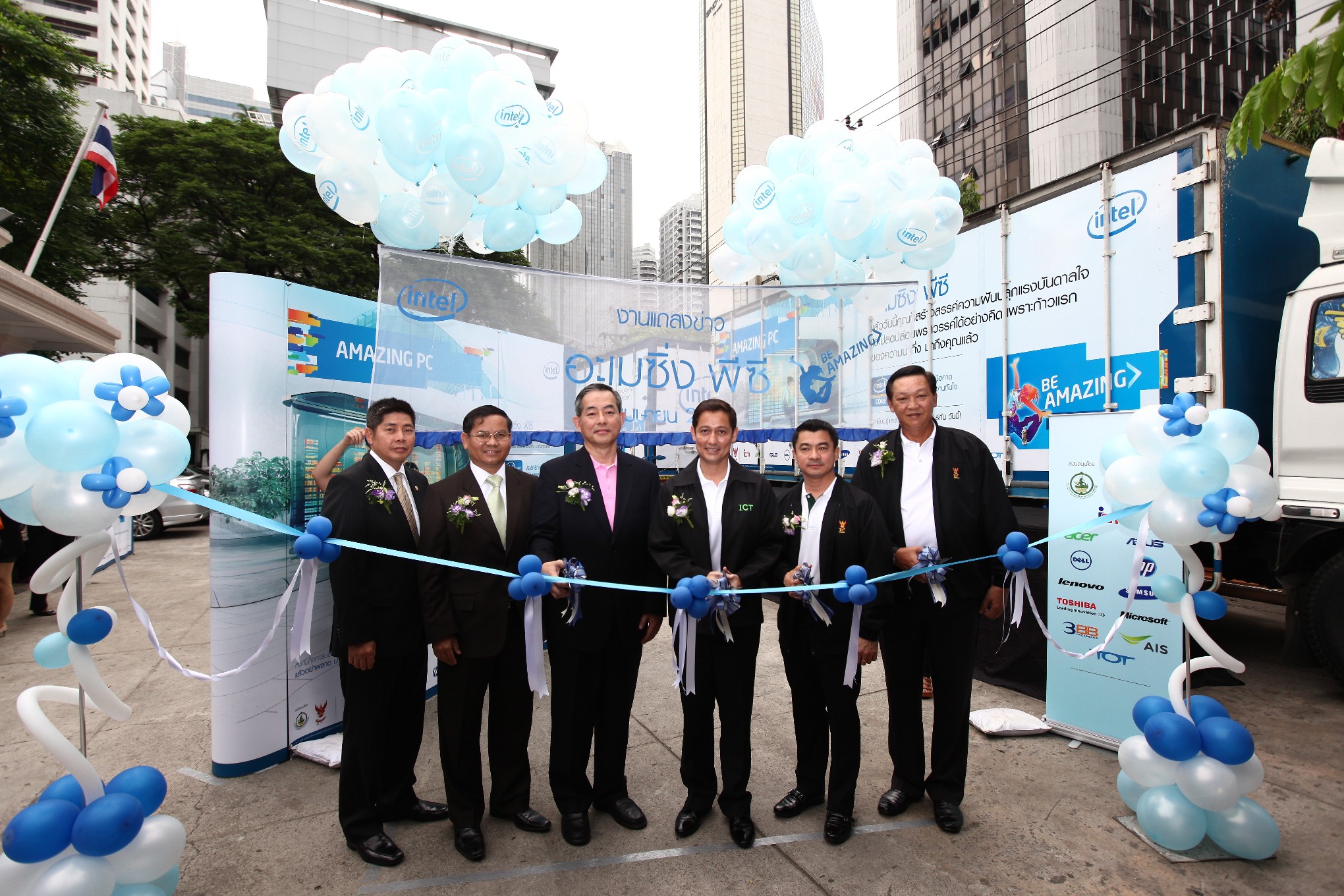 บริษัท อินเทล ไมโครอิเล็กทรอนิกส์ (ประเทศไทย) จำกัด จัดพิธีเปิดโครงการ "อะเมซิ่ง พีซี" เพื่อนำกิจกรรมที่ให้ความรู้และความบันเทิงไปสู่คนในชุมชนต่างๆ เกือบ 400 แห่ง ใน 67 จังหวัดทั่วประเทศ นำโดย นายเอกรัศมิ์ อวยสินประเสริฐ (ที่ 3 จากซ้าย) กรรมการผู้จัดการ พร้อมด้วย นาวาอากาศเอก อนุดิษฐ์ นาครทรรพ (ที่ 3 จากขวา) รัฐมนตรีว่าการกระทรวงเทคโนโลยีสารสนเทศ และการสื่อสาร นาวาอากาศเอกรองศาสตราจารย์ ดร.ประสงค์ ปราณีตพลกรัง (ที่ 2 จากซ้าย) ที่ปรึกษารัฐมนตรีว่าการกระทรวงเทคโนโลยีสารสนเทศ และการสื่อสาร พันเอก ดร. เศรษฐพงค์ มะลิสุวรรณ (ที่ 2 จากขวา) รองประธานกรรมการกิจการกระจายเสียง กิจการโทรทัศน์ และกิจการโทรคมนาคมแห่งชาติ (กสทช.) พลเอก สุกิจ ขมะสุนทร (ขวาสุด) กรรมการกิจการกระจายเสียง กิจการโทรทัศน์ และกิจการโทรคมนาคมแห่งชาติ (กสทช.) และประธานอนุกรรมการการจัดให้มีบริการโทรคมนาคมพื้นฐานโดยทั่วถึงและบริการเพื่อสังคม และนายศักดิ์ณรงค์ แสงสง่าพงศ์ (ซ้ายสุด) เลขาธิการสถาบันเทคโนโลยีสารสนเทศและการสื่อสารเพื่ออุตสาหกรรม (ICTI) และประธานกลุ่มอุตสาหกรรมซอฟต์แวร์ สภาอุตสาหกรรมแห่งประเทศไทย ประเด็นข่าว- อินเทลเปิดตัวโครงการ "อะเมซิ่ง พีซี" ให้ความรู้ถึงประโยชน์ของเทคโนโลยีผ่านกิจกรรมการเรียนรู้ เพื่อเปิดโลกทัศน์การใช้เทคโนโลยีที่น่าตื่นเต้นสำหรับคนไทยทั่วประเทศ ในรูปแบบของคาราวาน "อะเมซิ่ง พีซี" ที่จะนำกิจกรรมที่ให้ความรู้และความบันเทิงไปสู่คนในชุมชนต่างๆ เกือบ 400 แห่ง ใน 67 จังหวัดทั่วประเทศ
