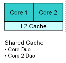 ข้างบน ภาพแสดงลักษณะการใช้แคชของ Core Duo และ Core 2 Duo
