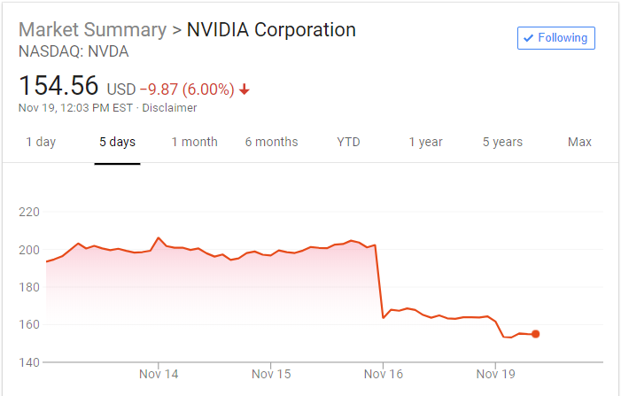 Nvidia ราคาหุ้นปรับตัวลดลงอย่างมากเป็นผลมาจากการ์ดจอรุ่นใหม่ยังขายได้ไม่ดีเท่าที่ควร