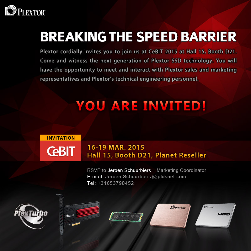 ท่านสามารถพบ Plextor ในงาน CeBIT Hannover ประเทศเยอรมัน ตั้งแต่วันที่ 16 -19 มีนาคม พร้อมการแสดงโซลูชั่นและผลิตภัณฑ์ ที่ Planet Reseller (Hall 15, Booth D21)