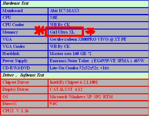 มาดูกันต่อเลยครับและนี่คือระบบที่ผมจะใช้ในการ ทดสอบ อ๋อๆๆๆ เกือบลืมไป การทดสอบแรมเทพคู่นี้ จะไม่ค่อยมีผลเทสเท่าไหร่น่ะครับ เพราะมันไม่ใช่จุดประสงค์หลักของ บทความนี้ อิอิอิอิ เดี๋ยวตอนท้ายผมจะบอกอีกทีว่าบทความนรกแตกบทความนี้ผมทำขึ้นมาเพื่ออะไร ใครอยากรู้ต้องติดตามต่อไปนะ คร๊าบบบบบบบ ขอบอกอีกด้วยว่าถ้าใครไม่อ่านและ ดูตามเรื่อยๆ จะไม่เข้าใจว่าผมต้องการจะสื่อถึงอะไร หุหุหุ เอาเป็นงานบทความนี้ก็เหมือนการเข้าเรียนล่ะครับ เข้าสายหรือ ไม่เข้า มาอ่านสรุปทีเดียวก็ไม่แจ่มเท่าหรอกเด้ออออออออ ( อันนี้มันตอนตรูสอบ นี่หว่า อ่านสรุปอย่างเดียวเลย อิอิอิ )