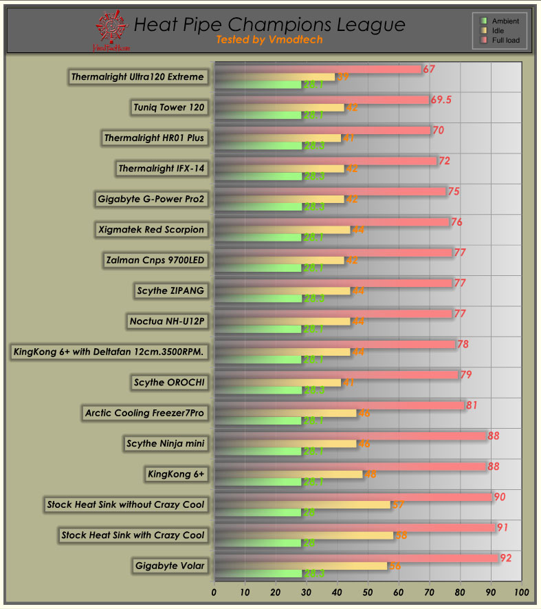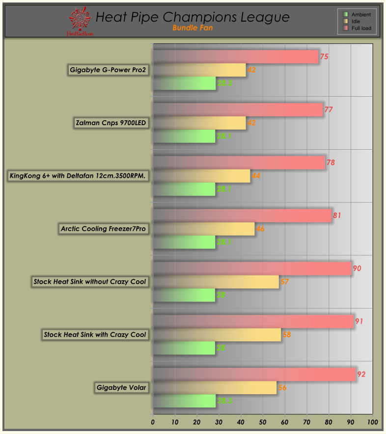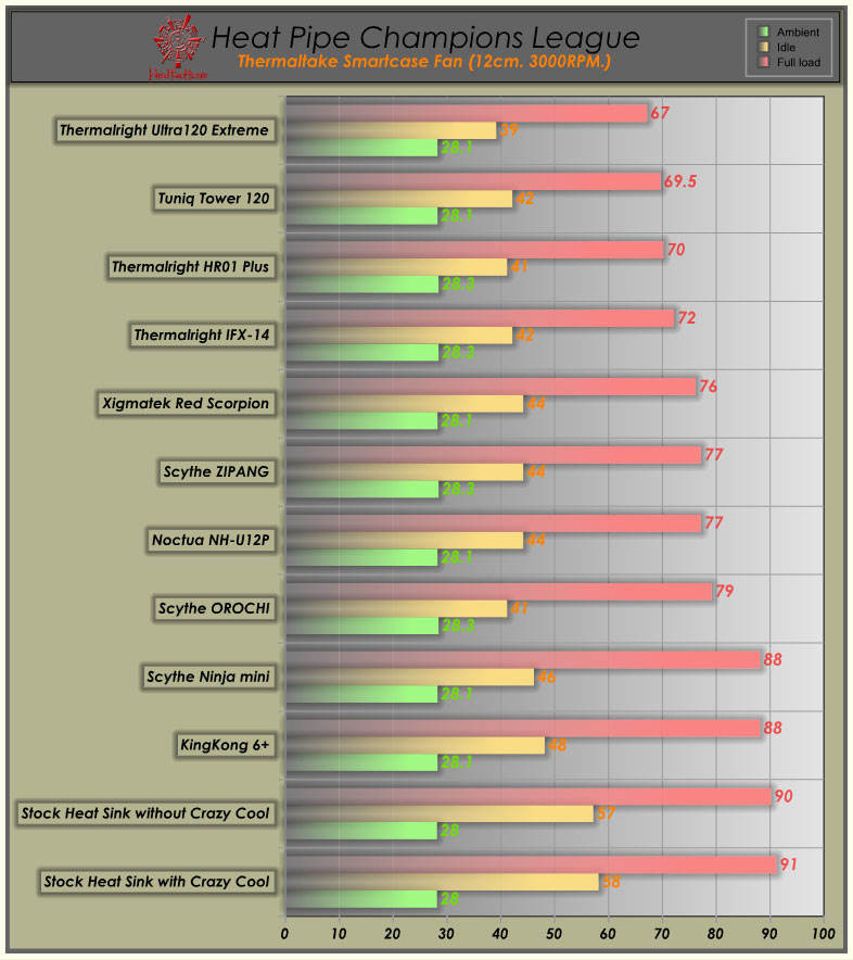 และนี่ก็เป็น ผลการทดสอบทั้งหมดครับ แต่ต้องอย่าลืมว่า ยังคงมีฮีทซิงค์บางตัวที่เราไม่ได้ทำการทดสอบภายใต้เงื่อนไขเดียวกันคือใช้พัดลม TT Smartcase II 3000rpm ในการทดสอบครับ เราจึงได้ทำ Graph แยกออกมาอีกเป็นสองชุดด้วยกันด้านล่างครับ