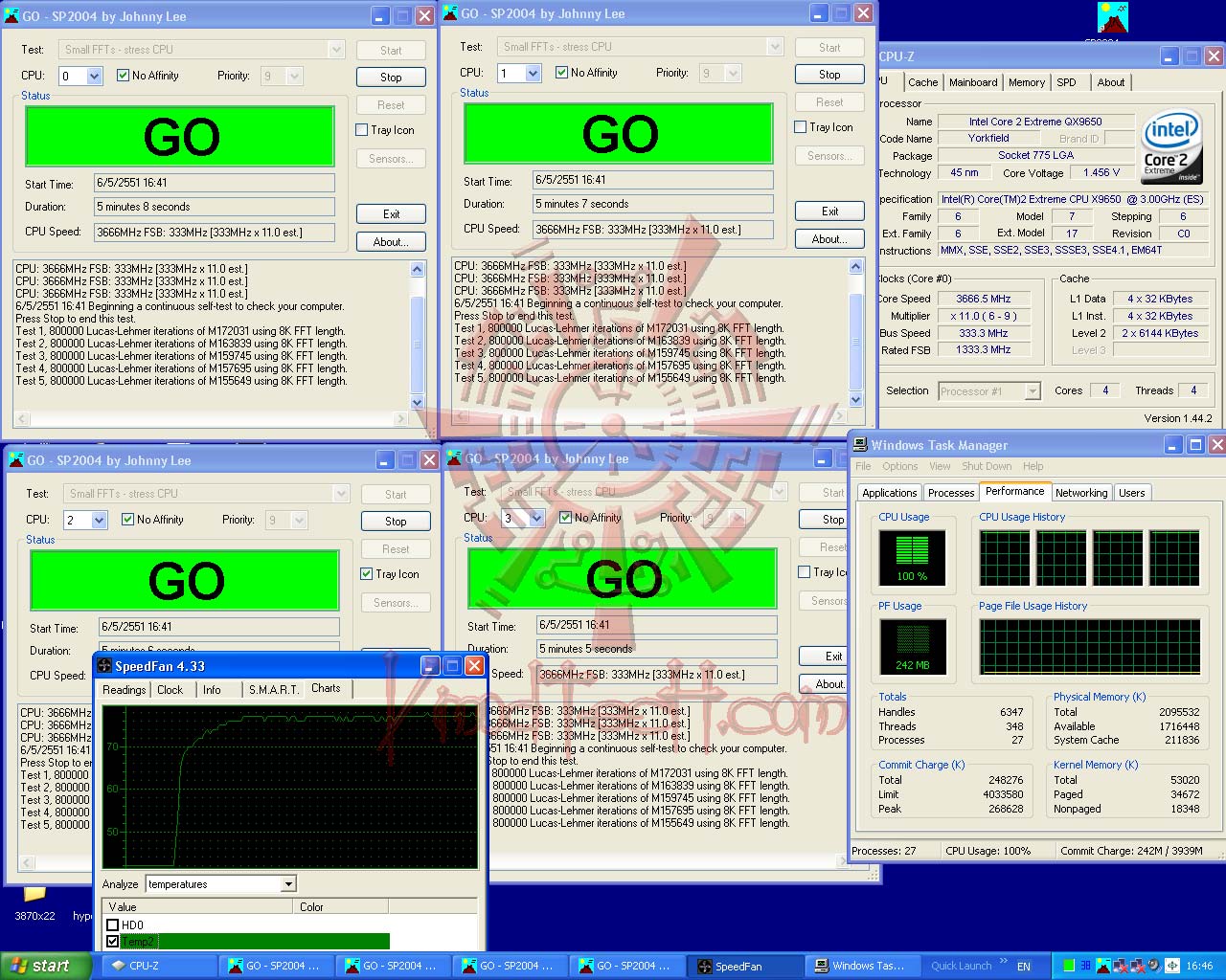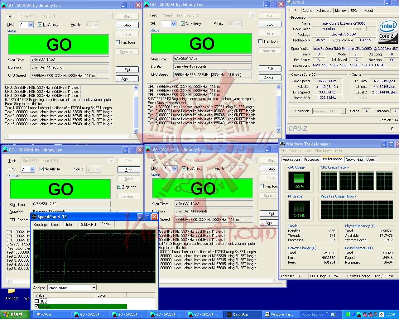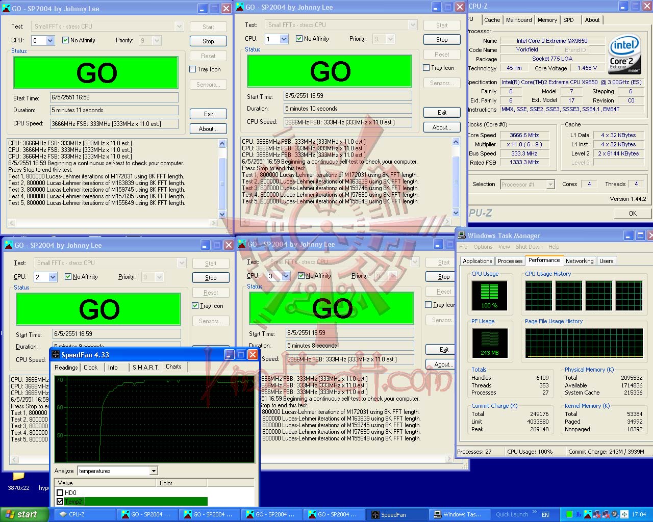 สำหรับระบบที่ใช้ในการทดสอบนั้นก็เป็นไปตามรูปและเสป็คที่ได้เขียนไว้ครับ โดยซีพียู QX9650 ที่เดิมมีอุณหภูมิค่อนข้างสูงอยู่แล้ว เมื่อทำการ overclock และเพิ่มไฟในไบออสไปถึง 1.5V. ที่ต้องทำแบบนี้ก็เพราะว่าเพื่อที่จะทำให้เกิดความร้อนมากๆ ระหว่างการทดสอบ และทำให้ฮีทซิงค์แต่ละตัวแสดงศักยภาพออกมาได้เต็มที่ ทำให้เห็นถึงความแตกต่างได้ชัดเจนมากยิ่งขึ้นครับ แต่เนื่องจากต้องทำการทดสอบกับซิงค์เดิมด้วย การโอเวอร์คล๊อกซีพียูของเรา จึงใช้วิธีการปรับตัวคูณขึ้นอย่างเดียวเท่านั้น และปรับไปที่ความเร็วเพียง 3.66Ghzเพราะจากที่ทดลองถ้าใช้ความเร็วเกินนี้แล้วซิงค์เดิมจะเอาเริ่มไม่อยู่ครับ และที่การOverclockของเราคราวนี้ ที่ใช้ปรับตัวคูณเอาอย่างเดียวนั้น ก็เพื่อไม่ให้ต้องมีการต้องทำการเพิ่มไฟในจุดอื่นๆบนเมนบอร์ด ซึ่งอาจจะเป็นการรบกวนอุณหภูมิของซีพียูนั่นเองครับ