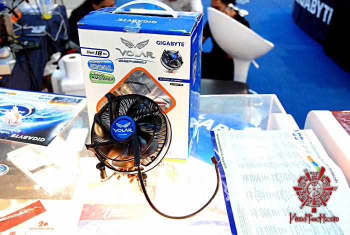 ฮีทซิงค์หน้าตาดีอีกตัวหนึ่งจากทาง Gigabyte ครับ โดดเด่นด้วยพัดลมไฟ LED สีฟ้า ใครที่เดินผ่านไปผ่านมาในบู้ต Gigabyte ทั้ง 9 วันในงาน DES Roadshow คงจะได้เห็นกันครับ เพราะว่าระหว่างที่วางโชว์อยู่กับเครื่องสาธิตระบบ DES มีแต่คนมามุงดู ไม่ได้สนใจในระบบ DES เลยครับ แต่สนใจซิ้งค์กันครับ เพราะว่ามันโดดเด่นสะดุดตาจริงๆครับ อิอิ ฮีทซิงค์ตัวนี้ มีฮีทไปป์ 5 ท่อด้วยกันครับ และใช้ฐานยึดแบบเดียวกับซิงค์เดิม จึงทำให้ติดตั้งค่อนข้างง่ายมากๆครับ