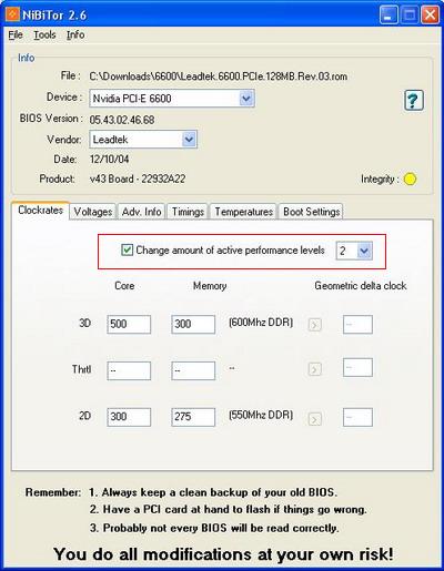 เมื่อเปิดโปรแกรมขึ้นมาก็เลือกopenfileไปยังไบออส6600ครับ ที่แถบClockrates ติ้กเครื่องหมายถูกตามรูป แล้วเปลี่ยนค่าเป็น2 (กรอบสีแดง) ซึ่งจะทำให้แก้ไขค่าความเร็วในโหมด2Dได้ด้วยครับ ส่วนจะปรับเป็นความเร็วแค่ไหนนั้นก็อยู่ที่การ์ดจอครับว่าลากได้แค่ไหนแล้วยังเสถียรอยู่(เราจะได้ไม่ต้องมานั่งแก้ไขค่าความเร็วบ่อยๆ และการ์ดไม่ต้องทำงานหนักเกินความจำเป็นในโหมด2Dครับ)