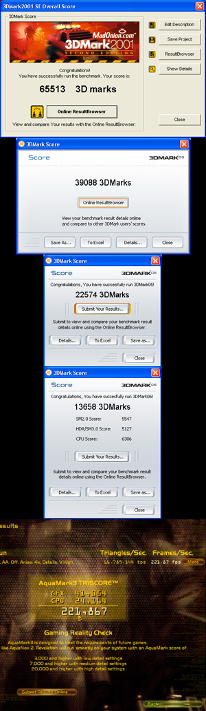 1.1. Synthetic Benchmark ได้แก่โปรแกรม 3Dmark01se 3Dmark03 3Dmark05 3Dmark06 ทดสอบเทียบกันสองการ์ด และนำการ์ดรุ่นเก่ากว่า อย่าง HD2900XT มาร่วมทดสอบด้วย