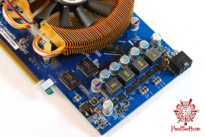 ตัวการ์ดดูไม่ค่อยอลังการเท่ากับ 9600 ครับ จากที่เห็นในรูป PCB ก็จะเป็นสีฟ้าตามสไตล์ของ Gigabyte นอกจากนี้ได้ถูกติดตั้งซิ้งค์ในรุ่นVF830 จากแซลแมน มาจากโรงงานเลยทีเดียว ซึ่งผลลัพท์ที่ได้คือเสียงในขณะทำงานค่อนข้างเงียบกว่า N9600GT ของ MSI มากเลยทีเดียวครับ แต่ก็เข่นเดิมครับ เม็ดแรมก็ไม่ได้มีการติดตั้งฮีทซิ้งค์มาให้ รวมไปถึงความร้อนในขณะทำงานก็สูงตามสไตล์ของ 8800GT อยู่เช่นเคยครับ