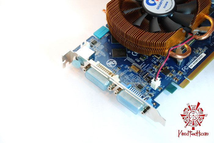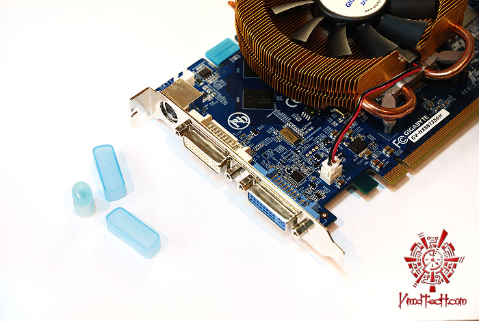 พอร์ตก็ตามมาตรฐานของการ์ดในระดับนี้ คือ Dual DVI ครับ อาจจะดูแปลกตาไปสักนิด เพราะ DVI เป็นสีน้ำเงินครับ และก็ยังคงมี TV-Out มาให้ด้วย ตัวการ์ด เป็น 2 สลอต ครับ กินเนื้อที่ Bracket ด้านหลังเคสไปด้วยถึง 2 สลอตด้วยกันเลยทีเดียวครับ