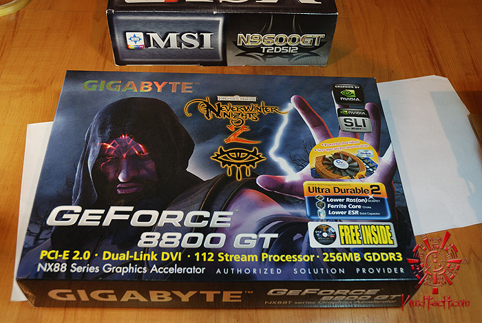 กล่องของ 8800GT กิกาไบท์ในรุ่นนี้ก็จะเป็นลาย Neverwinter Nights ครับผม พร้อมทั้งอธิบายสรรพคุณตามสไตล์การ์ดจอละนะครับ
