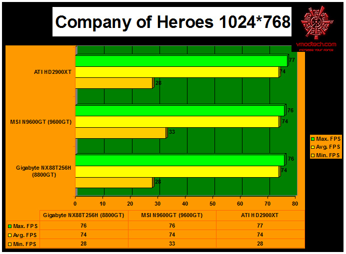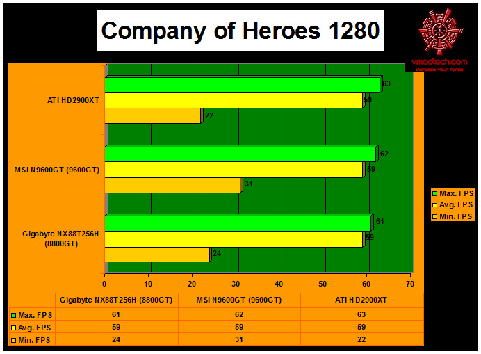 ค่อนข้างสูสีกันเลยทีเดียวครับ สำหรับเกม Company Of Heroes แต่ดูเหมือนว่า HD2900XT จะสามารถคุม FPS ให้อยู่นิ่งได้น้อยกว่า nvidia ทั้งสองตัว และก็ดูเหมือนว่า 9600 จะสามารถเลี้ยง FPS ต่ำสุดได้ดีกว่า 8800GT คงจะเพราะว่า 8800GTจากกิกาไบท์ในรุ่นนี้นั้น นั้นมี เมมโมรีในตัวน้อยกว่า นั้นคือเพียงแค่ 256mb เท่านั้น ส่วน 9600GT นั้นพกมาถึง 512mb ด้วยกันครับ