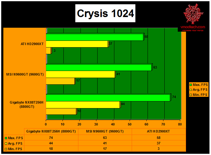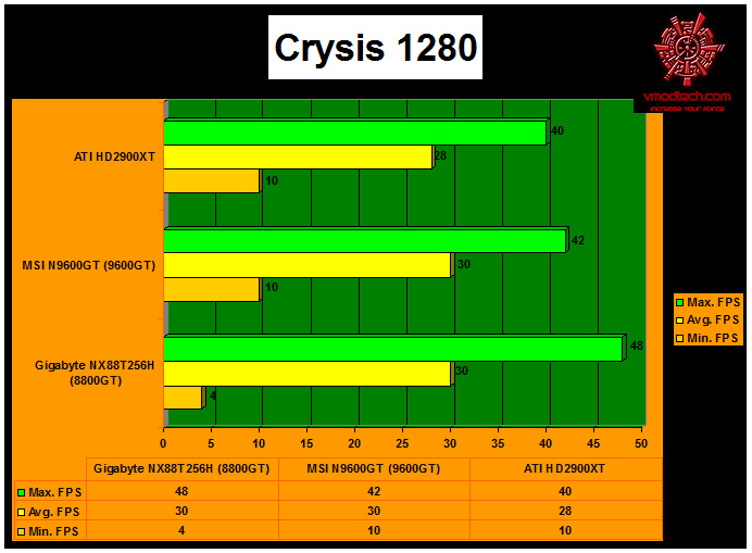 ดูเหมือน 8800GT จะแผลงฤทธิ์กับ Crysis ครับ เพราะตอนนี้ 8800GT จะเป็นผู้นำในจ่าฝูงไปเรียบร้อย ในขณะที่ HD2900XT นั้นไม่สามารถสู้ความสดของ 8800GT และ 9600GT ได้