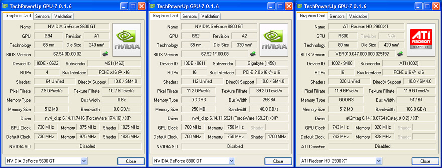 Gigabyte NX88T256H | MSI N9600GT | ATI Radeon HD2900XT |