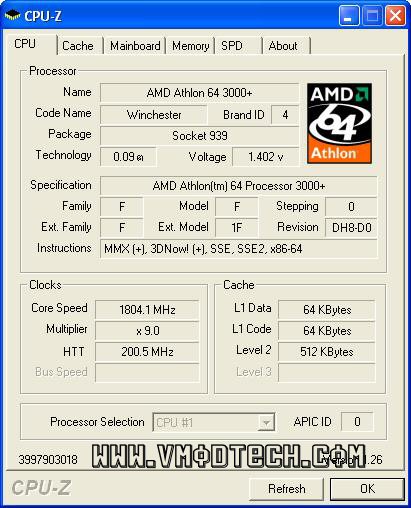 cpu รันที่ 9*200=1.8GHz ซึ่งเป็นความเร็วเดิมของเจ้า 3000+ ส่วนแรมก็รันที่บัส200 เช่นกัน