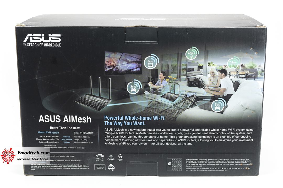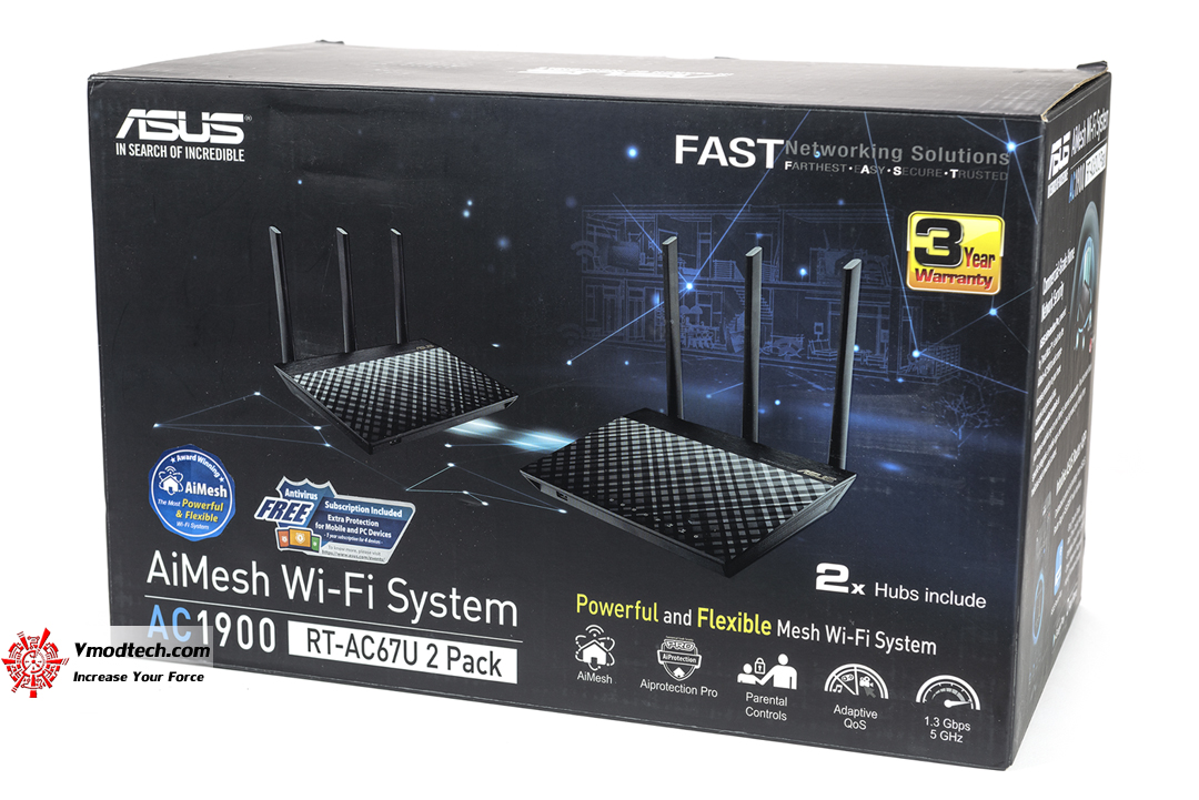 กล่องบรรจุ AiMesh AC1900 WiFi System (RT-AC67U 2 Pack) นั้นใหญ่โตเอาเรื่องครับ ด้านกลังกล่องนั้นก็มีการอธิบายคุณสมบัติหลักเอาไว้ให้พิจารณาอย่างชัดเจนถึงคุณสมบัติที่มีมาในตัว