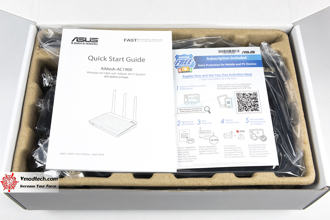ภายในกล่องนั้นจะมีกล่องสีสีขาวบรรจุอยู่สองกล่องซึ่งแต่ละกล่องจะเป็นตัว Router RT-AC67U อยู่อย่างละเซต นี่เป็นรูปจากภายในกล่องหลังเปิดฝาขึ้นมาก็จะเห็นตัวเราเตอร์นอนนิ่งสงบอยู่แบบนี้