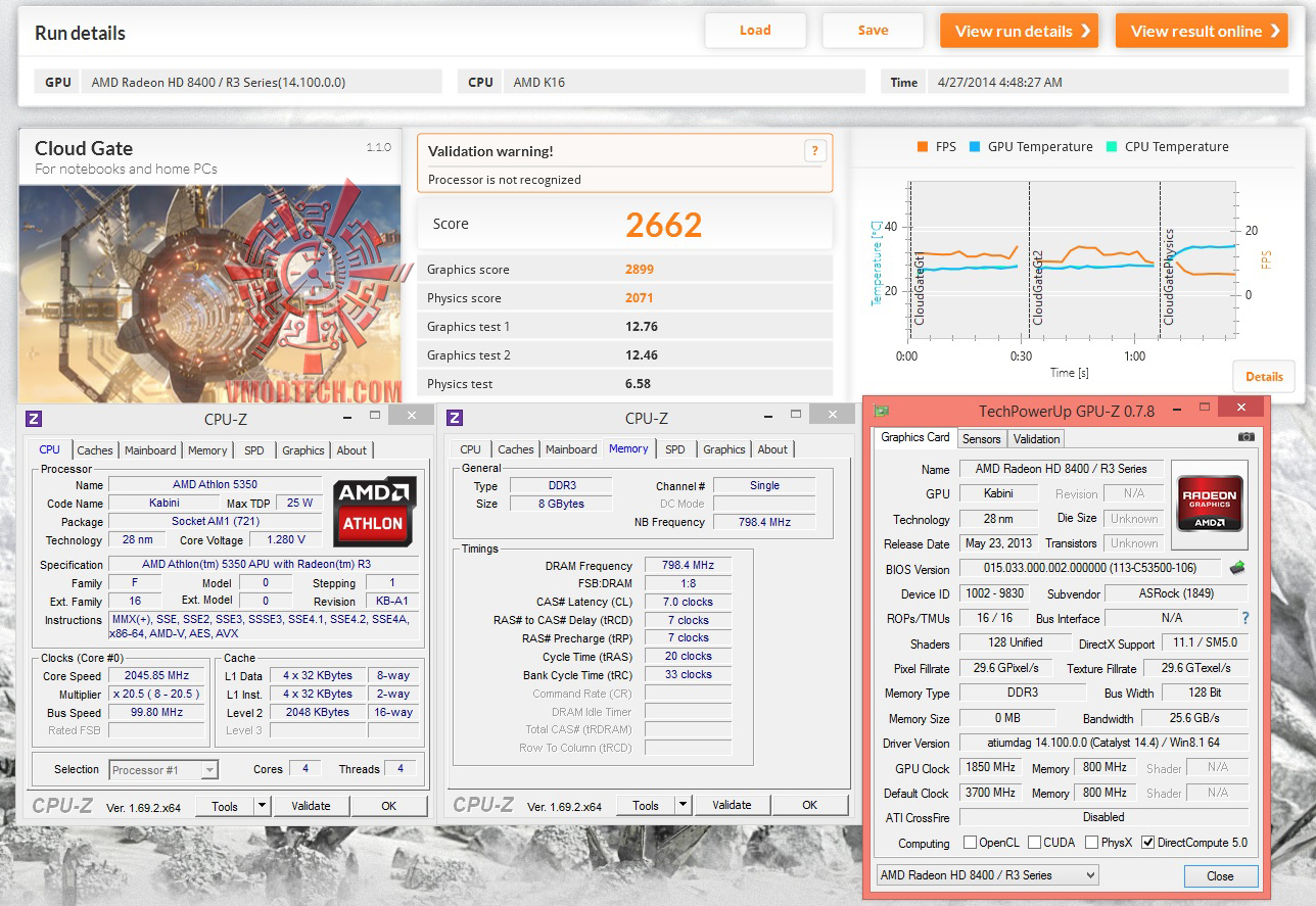3DMark เทสผ่านกันมาได้ครับถึงคะแนนจะได้ได้โดดเด่นมากเพราะซีพียูถูกออกแบบมาให้ใช้งานทั่วไปในงานที่ไม่ได้เน้นหนักในด้าน 3D แต่คะแนน Fire Strike อยู่ที่ 418 คะแนนเลยครับ ตามที่ทาง AMD เคลมเอาไว้จริงๆ