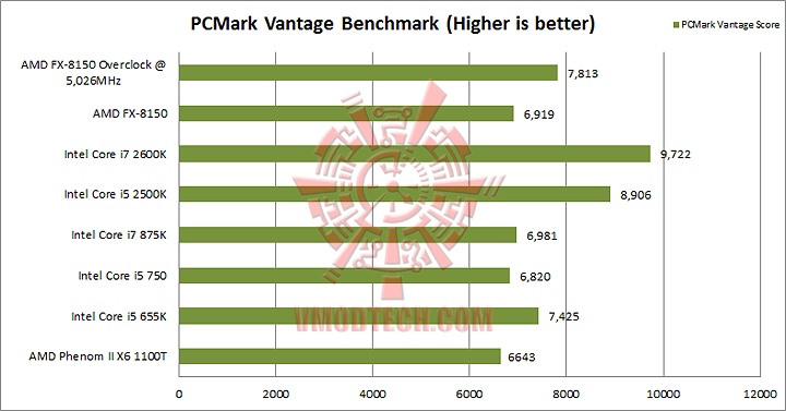 …กับ 3DMark Vantage ที่ทันสมัยขึ้นมาอีกนิด จะเห็นได้ว่า Bulldozer ก็แผลงฤทธิ์อีกแล้วครับ ปั่นคะแนน CPU และพ่วงกับ GPU ให้มีคะแนนแซงกันไปได้อย่างสวยงาม