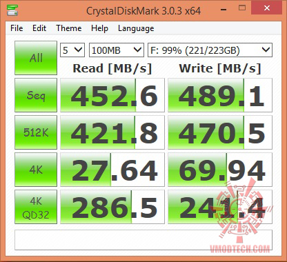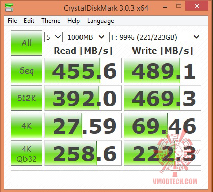 AS SSD Benchmark ก็แรงดีเลยครับ เรียกได้ว่าการอ่านเขียนนั้นทำได้ดีครับแม้ว่าจะอัดข้อมูลลงไปถึง 99เปอร์เซ็นของความจุก็ไม่ทำให้ความเร็วนั้นตกลงแต่อย่างใดครับ เรียกได้ว่าลดลงบ้างหรือแทบไม่แตกต่างจากพื้นที่ว่างเลยครับ เยี่ยมจริงๆ