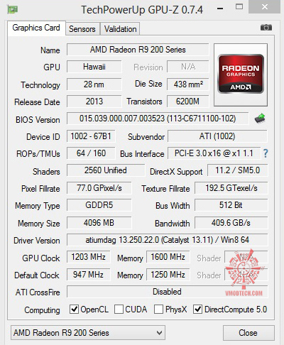 ความเร็วเดิมๆของ AMD RADEON R9 290 ครับ Baseclock Core 947Mhz Memory 1250Mhz ก็ถือเป็นค่ามาตราฐานของการ์ด Ref. ที่มาจากโรงงานเลยครับ