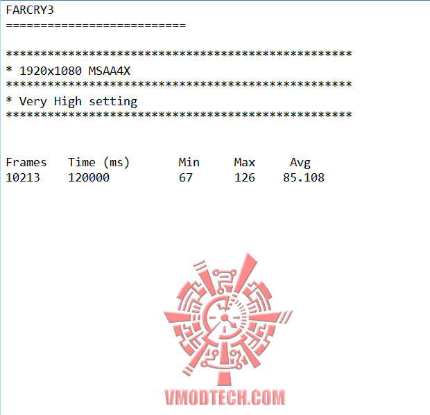 FARCRY3 ความละเอียด 1920X108 Very High MSAA 4X เฟรมเรตอยู่ที่ 85เฟรมเรต เล่นแบบลื่นๆเลยครับ ถ้าเปิดเต็มคงอยู่ราวๆ 60 เฟรมเรต แต่เผื่อค่าคอนฟิกไว้สำหรับผลทดสอบการ์ดรุ่นเล็กๆนะครับ