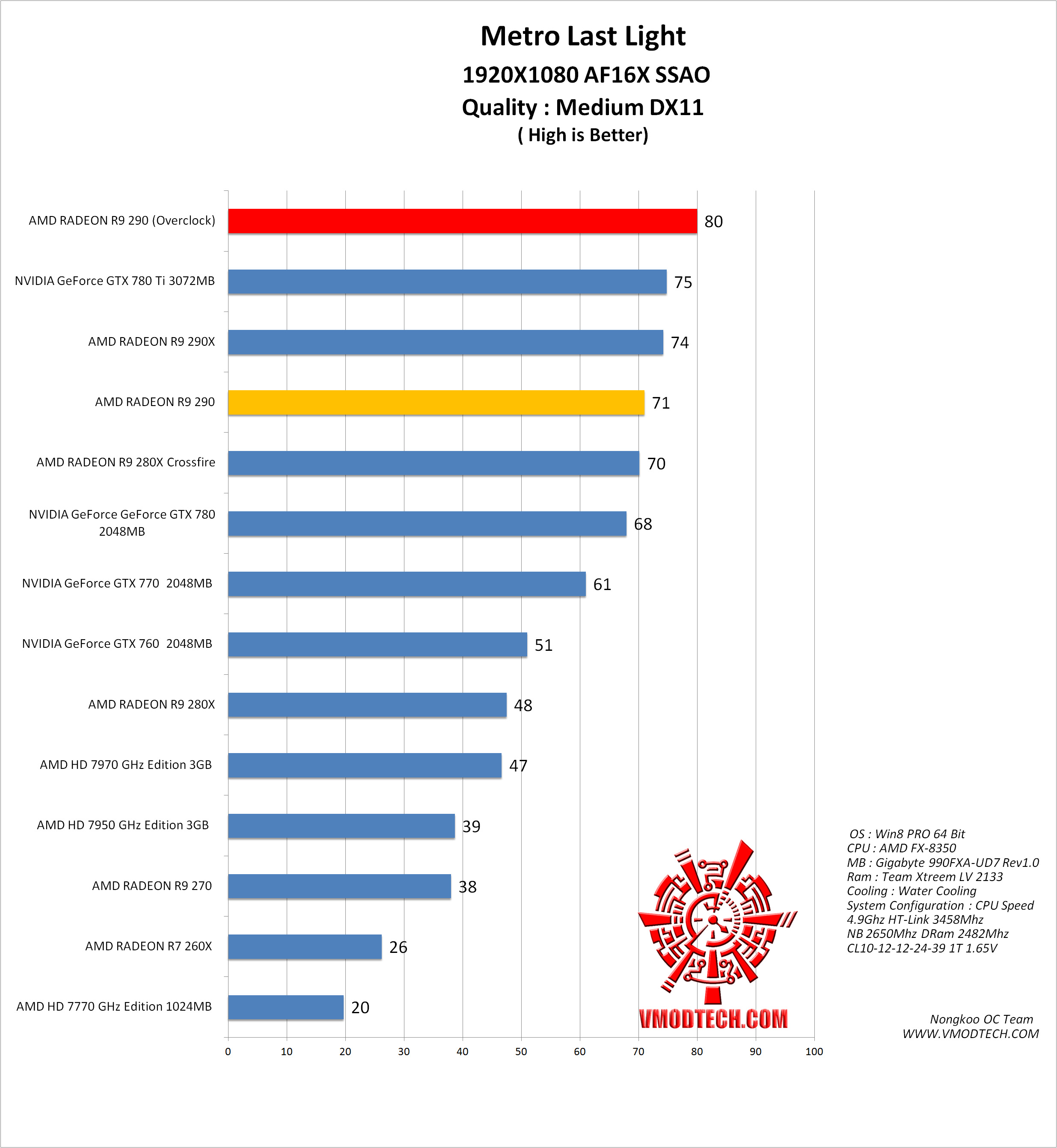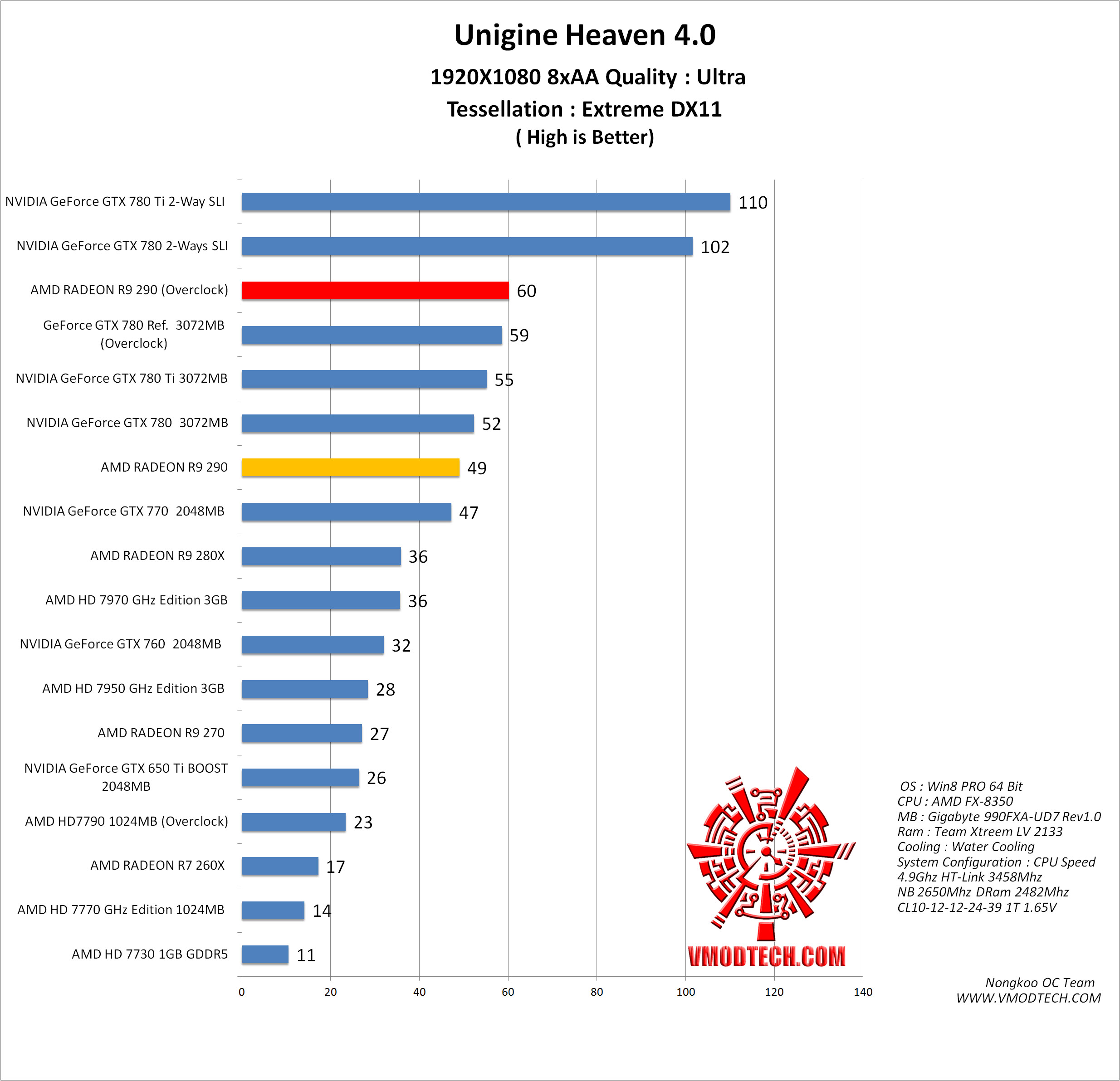 ก็มาถึงช่วงท้ายกันครับสำหรับการทดสอบ AMD RADEON R9 290 ที่ใช้งานร่วมกับระบบของ AMD FX-8350 อย่างเต็มรูปแบบของระบบ AMD ได้แบบชนิดเต็มประสิทธิภาพคุ้มค่าในระบบของ AMD เลยทีเดียวครับ กับซีพียูที่ราคาไม่แพงแต่แรงชนิดที่พา AMD RADEON R9 290 แรงแบบเต็มๆชนิดที่ว่าใช้งานเล่นเกมส์ใหม่ๆที่มีค่ากราฟฟิกสูงๆได้อย่างลื่นไหลมากเลยทีเดียว สำหรับ AMD RADEON R9 290 นั้นถ้าเราดูตามผลทดสอบที่โอเวอร์คล๊อกไปที่ค่าความเร็ว Core 1203Mhz Memory 1600Mhz นั้น ประสิทธิภาพความแรงนั้นเพิ่มขึ้นมาอย่างเห็นได้ชัดเลยครับ เรียกได้ว่าแรงแซงบรรดาการ์ดเบอร์ใหญ่ๆในค่า Defaut กันเลยทีเดียวไม่ว่าจะเป็นผลทดสอบ 3D / Gaming ต่างๆก็สร้างประสิทธิภาพความแรงได้ดีมากๆเลยครับ ถือเป็นการ์ดที่ผมมองว่าเป็นการ์ดจอที่คุ้มค่าอีกตัวหนึ่งเลยทีเดียวถ้าราคาไม่เปลี่ยนแปลงไปจากราคา 14-15K น่าจะเป็นตัวเลือกที่ดีสำหรับผู้ที่ต้องการการ์ดระดับ Hi-End เล่นได้ทุกเกมส์และใช้งานได้อย่างดีเยี่ยม AMD RADEON R9 290 ไม่ทำให้ผิดหวังอย่างแน่นอน สำหรับในวันนี้กระผมก็ขอตัวลาไปก่อน พบกันใหม่เร็วๆนี้กับรีวิวอุปกรณ์ใหม่ๆจัดเต็มทุกการทดสอบที่ Vmodtech.com สวัสดีครับ