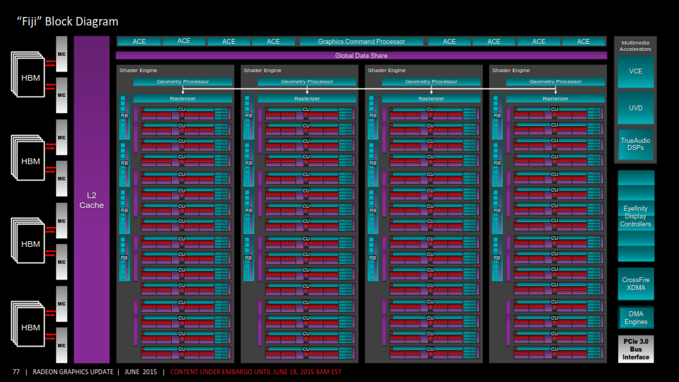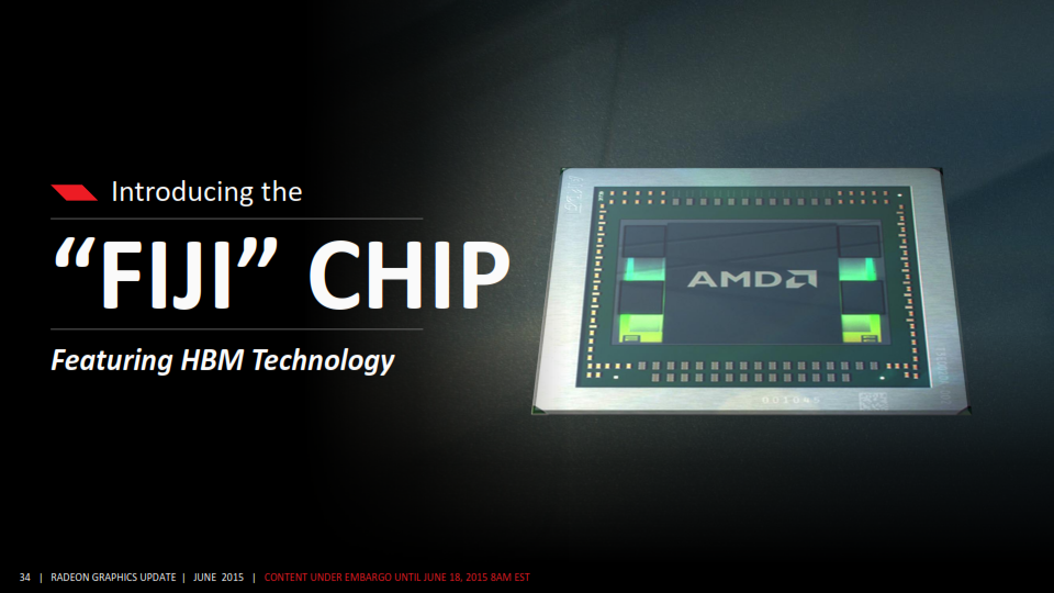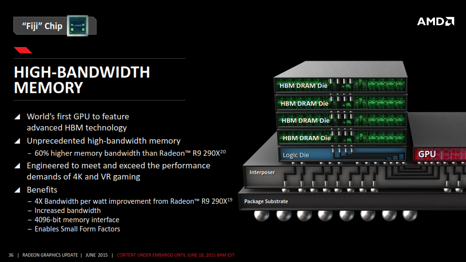 ตัวของ GPU ในโค๊ดเนม ” FIJI ” นั้นยังคงใช้ GCN Architecture และมีจำนวน Stream Processor ถึง 4096 กันเลยทีเดียว ประกอบกับชุดคำสั่งมากถึง 64 Compute Units ในส่วนของ HBM (High Bandwidth Memory) นั้นจะแบ่งชุดเมมโมรี่เป็น 4ชุด รายรอบตัว GPU ซึ่งมีความจุ 4GB ในแต่ละตัวจะมีความกว้างของบัสแบนด์วิดท์อยู่ที่ 1024bit รวมท้งหมด 4ตัวจะอยู่ที่ 4096bit กันเลยทีเดียว ซึ่งจะแตกต่างจากบรรดากราฟฟิกการ์ดในรุ่นก่อนๆที่ใช้ DDR5 ความกว้างของบัสแบนด์วิดท์จะอยู่ที่ 32bit เท่านั้น