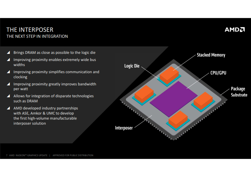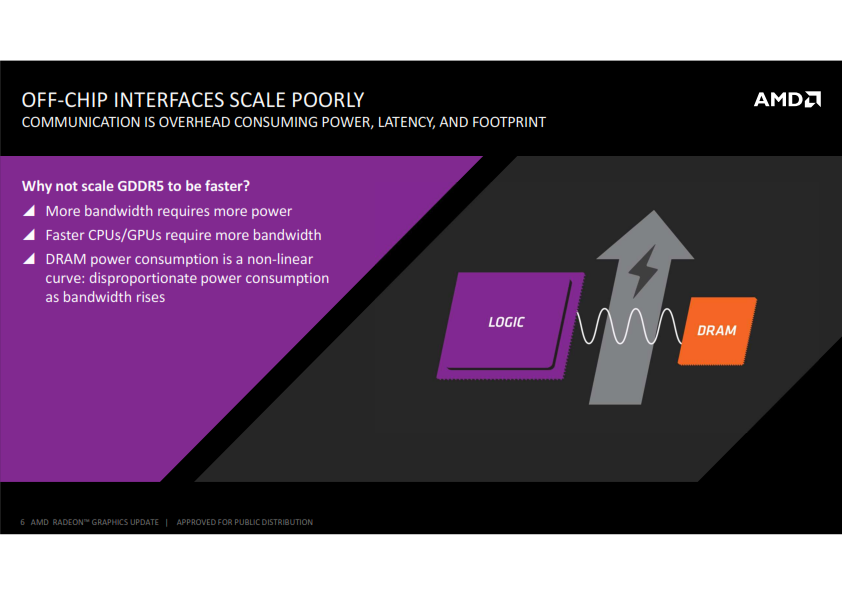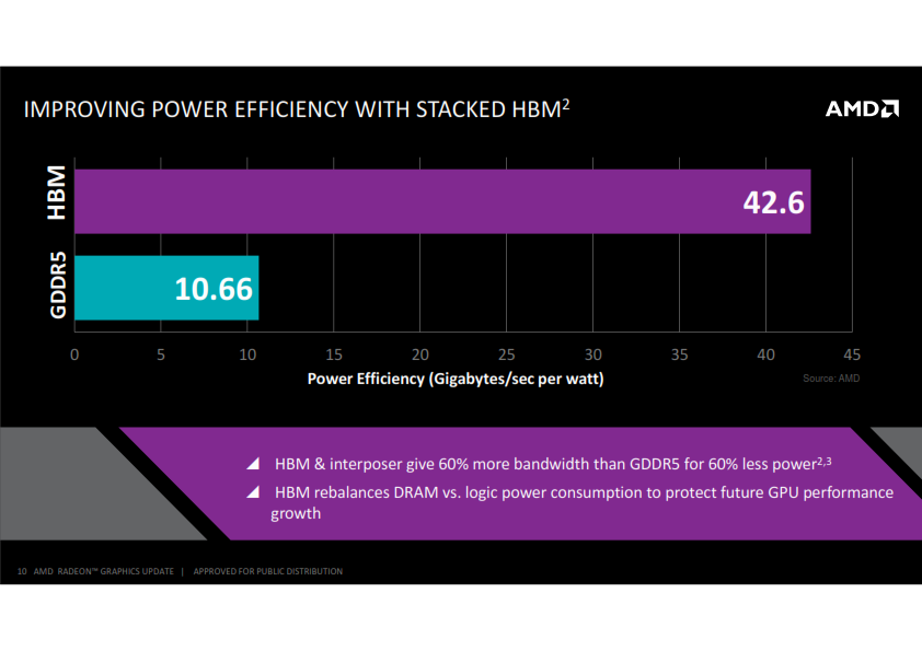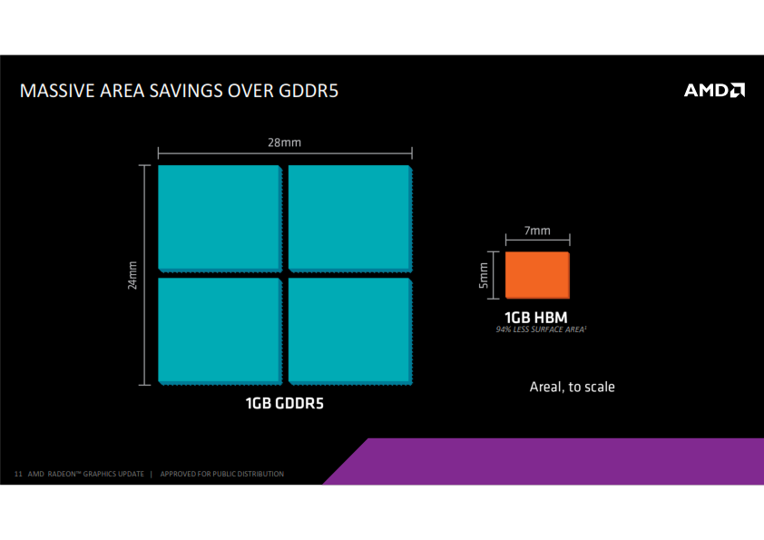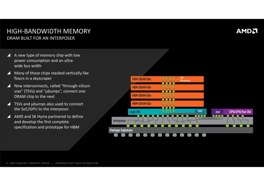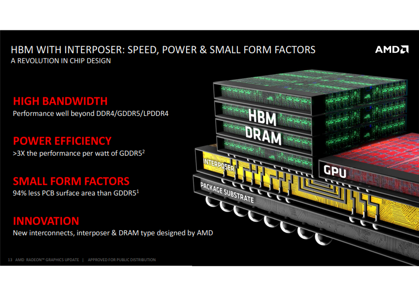 สถาปัตย์ใหม่ของ HBM (High Bandwidth Memory) นั้นแรงขึ้น เล็กลง ประหยัดพื้นที่เพิ่มมากขึ้น การส่งถ่ายข้อมูลดีมากขึ้น กินไฟน้อยลง รวมทั้งการดีไซน์ที่ทันสมัย