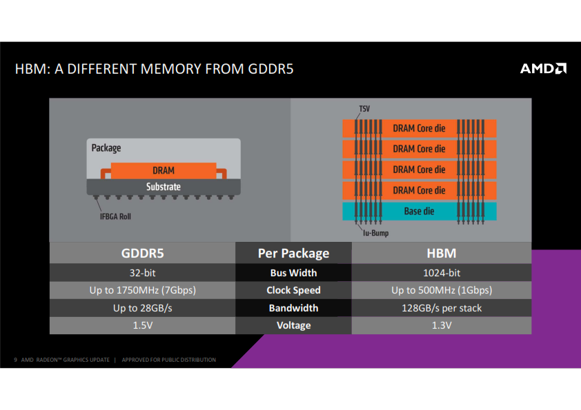 จากตารางจะเห็นการเปรียบเทียบระหว่าง DDR5 กับ HBM ซึ่งเมื่อเปรียบเทียบแล้วขนาดความกว้างของบัส HBM มีความกว้างมากกว่าถึง 1024-bit ต่อ 1ชิพ แต่ค่า Clock Speed จะลดลงเหลือเพียงแค่ 500Mhz (1Gbps) ต่อพิน ซึ่งเมื่อรวมกันทั้ง 4ตัวแล้วจะมีแบนวิธท์ทั้งหมดกับตัว GPU ได้มากถึง 512GB/s โดยแต่ละชิพจะมีแบรนด์วิธอยู่ที่ 128GB/s กันเลยทีเดียวและใช้ไฟเลี้ยงต่ำกว่า 1.3V